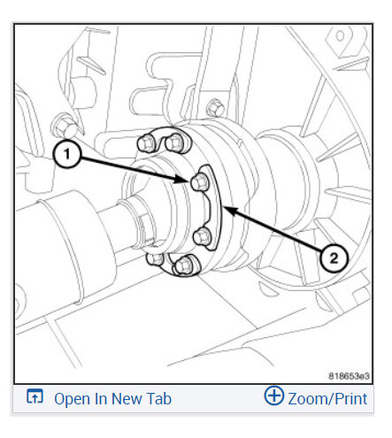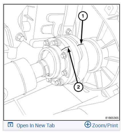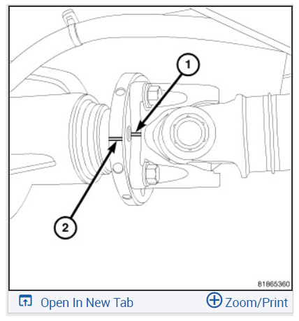 3. Mark an installation reference line across the front propeller shaft flange (1) and the axle flange (2).