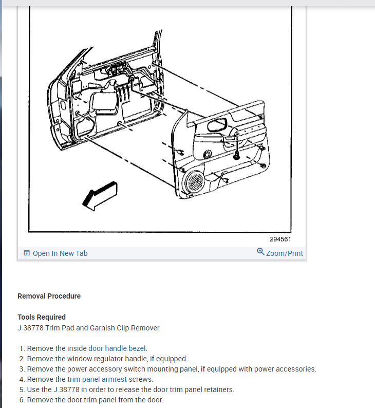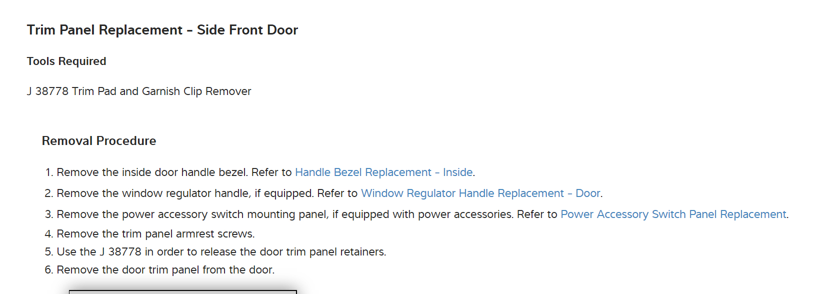 1. Disengage the door trim, without detaching the inside door handle cable. DO NOT LET THE TRIM PAD HANG FROM THE HANDLE CABLE OR THE WIRE HARNESS.