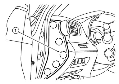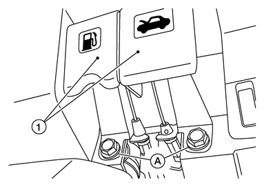 Remove bolts (A) and fuel filler lid/hood lock release handle (1) from instrument lower panel LH.