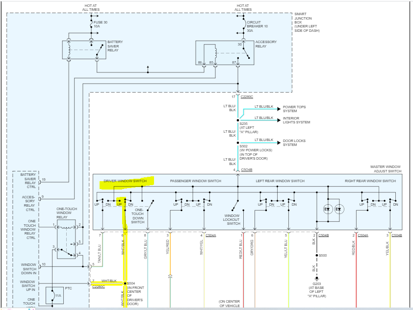 If you look below, I provided a wiring schematic of the power windows. What I need you to do is check for power at the driver's switch. There will be a white wire with a black tracer. That should have power when you put the window up. Check that for me. Here is a link you may find helpful: