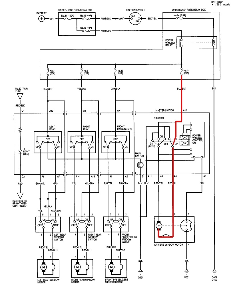 The motor is not suspect. It has to be okay if it runs one way. The same is true of most of the wiring. It is shared in both directions. What is not shared is part of the "Down" switch. Half of it remains grounded when you press the "Up" switch to provide the ground for the motor. The test for this involves taking voltage readings on the two wires at the motor. With all the switches released, you will find 0.0 volts on both wires. I highlighted the "Up" circuit in the second diagram, with the red line. When you press the "Up switch, you should find 12 volts on the red / blue wire. Of equal importance, you must find very close to 0 volts on the red / yellow wire. If you find anything other than 0 volts, there has to be a break in that ground circuit. We know it can't be in the wires because they're used for the "Down" function too. The only part of that circuit that's left is the released half of the "Down" switch. Let me know what you find with these voltages.