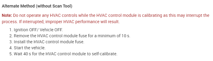 When replacing the HVAC control module it will be necessary to allow the HVAC control module to perform a calibration process. When installing the HVAC control module be sure to perform the following: