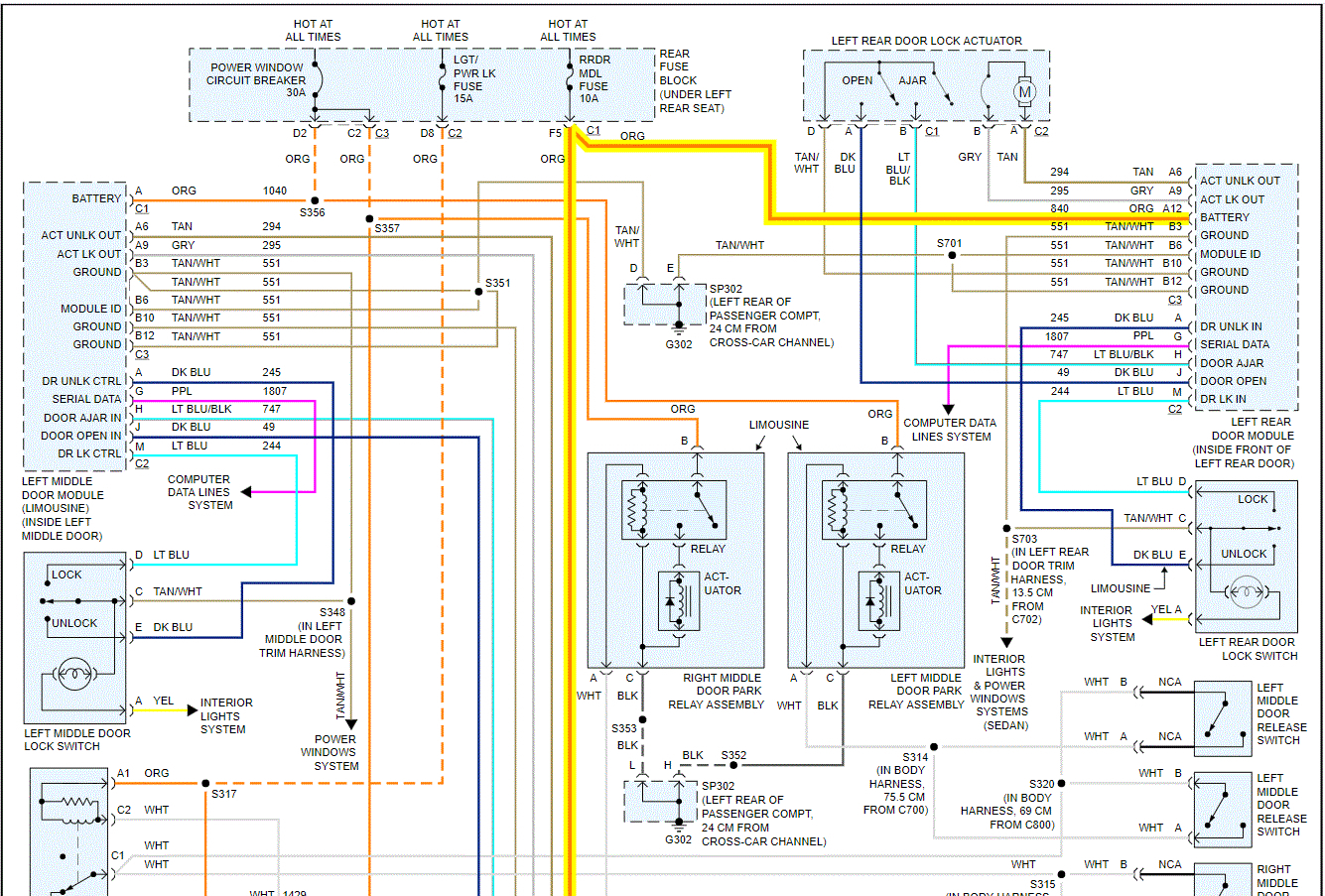 Since nothing is working on the left rear door, we need to confirm there is power getting to the left rear door module. First, if the right rear door is working, then it isn't a fuse because both doors get power from the same fuse. So, remove the door panel and locate the door module. Disconnect the door module and locate the orange wire to it. That wire should have power.