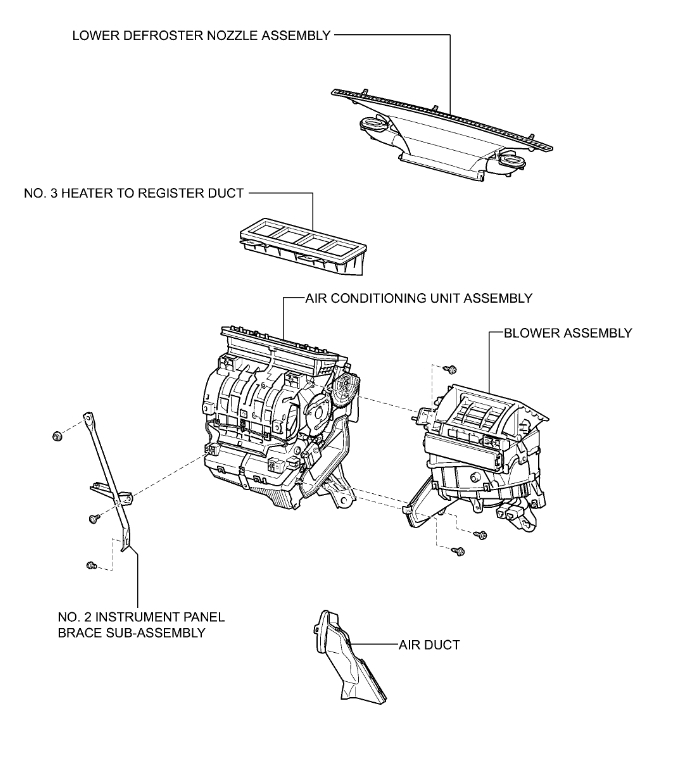 The only way to remove the dropped screw is to dissemble the HVAC housing. start by draining the coolant and discharging the A/C system. Here is a video that can help with the A/C recharge: