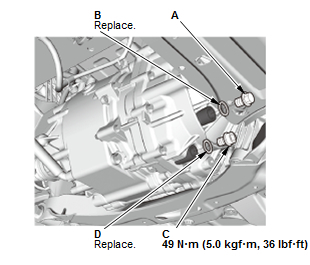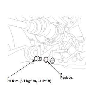 Remove the drain plug (C) and the sealing washer (D) of the gear box side, remove the drain plug (E) and the sealing washer (F) of the motor side, and drain the ATF.