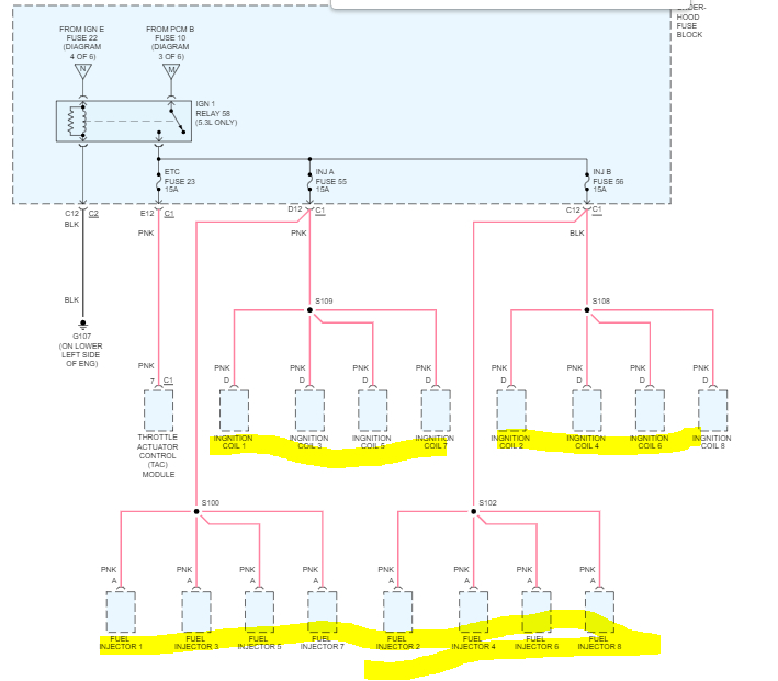 If the issue seems related to the ignition switch, we have fuses to check and power out from the switch itself, so let me know. Also, at each fuel injector and each ignition coil, there will be a pink wire. That is the power supply when the key is in the run or start position. Turn the key to the run position and confirm power. If there is none, check for power when a helper turns the key to the start position. You should have it then. See pic 1