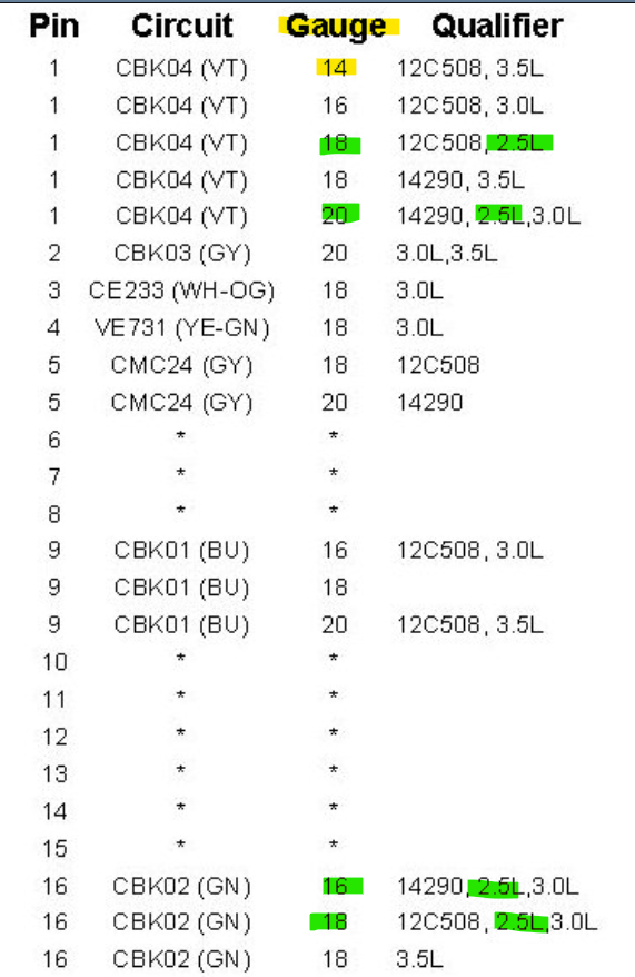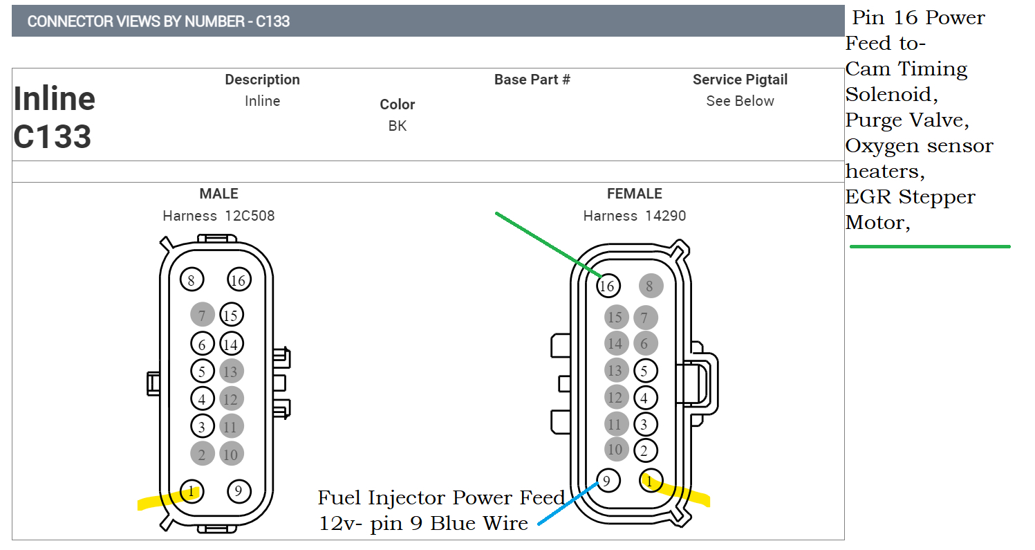 Pin 9 is the fuel injector power feed, pin 16 powers the Cam Timing Solenoid, Purge Valve, Oxygen sensor heaters, EGR Motor,