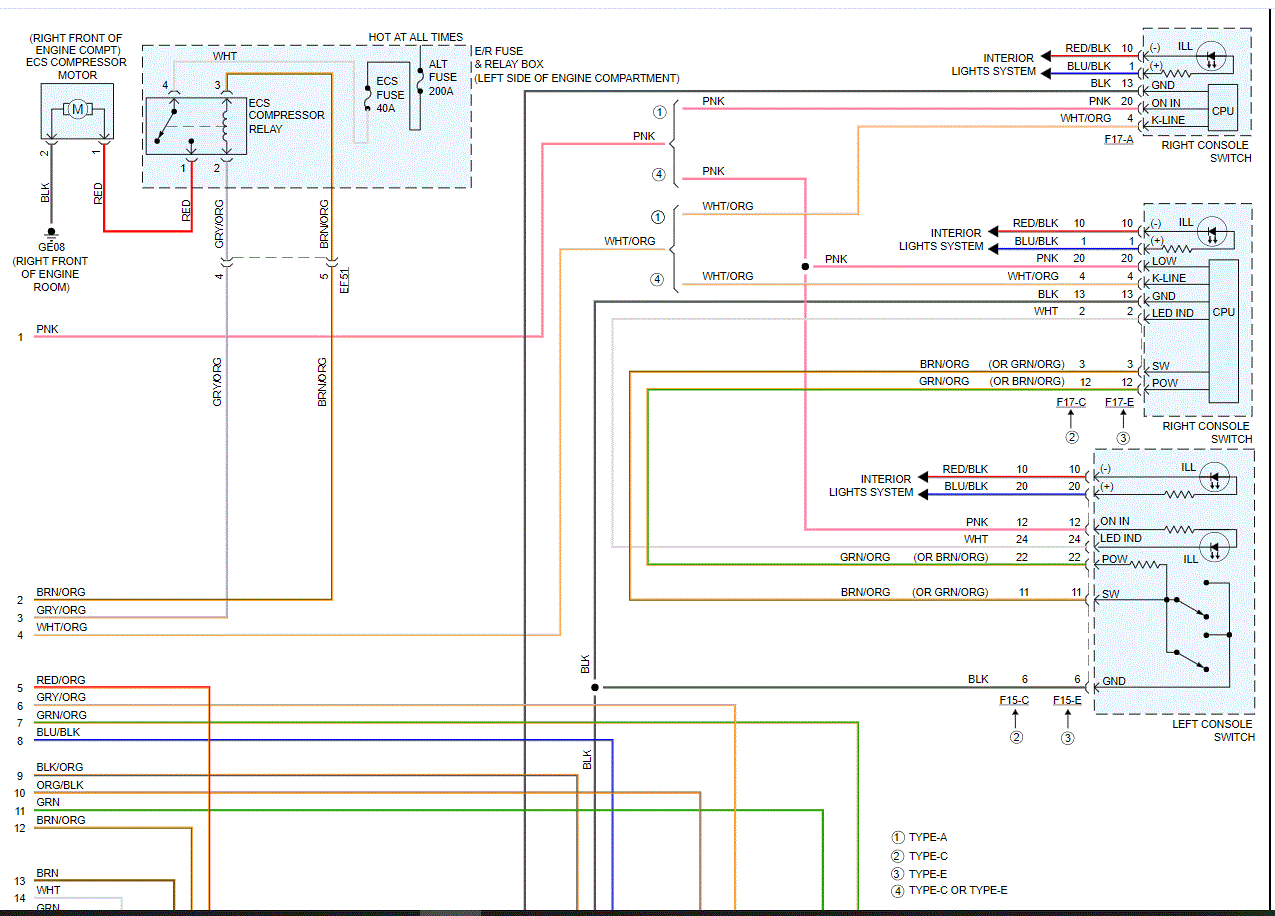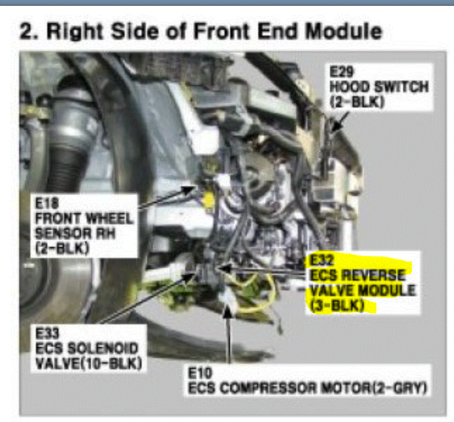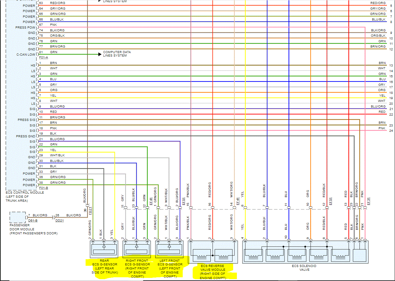Also, pics 3, 4, 5, and 6 are the wiring schematic of the ECS system. There were two pages, but I had to cut them in half to make them readable for you. I did overlap them so you can follow from one to the next. In the second wiring schematic pic, I highlighted the solenoids related to the system. Note that the reverse valve is located under the hood on the right side of the engine compartment.