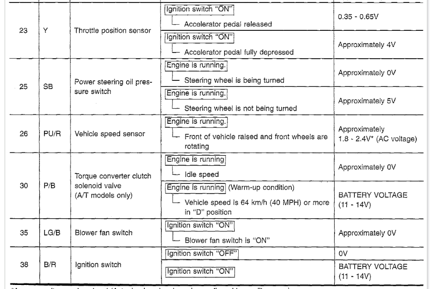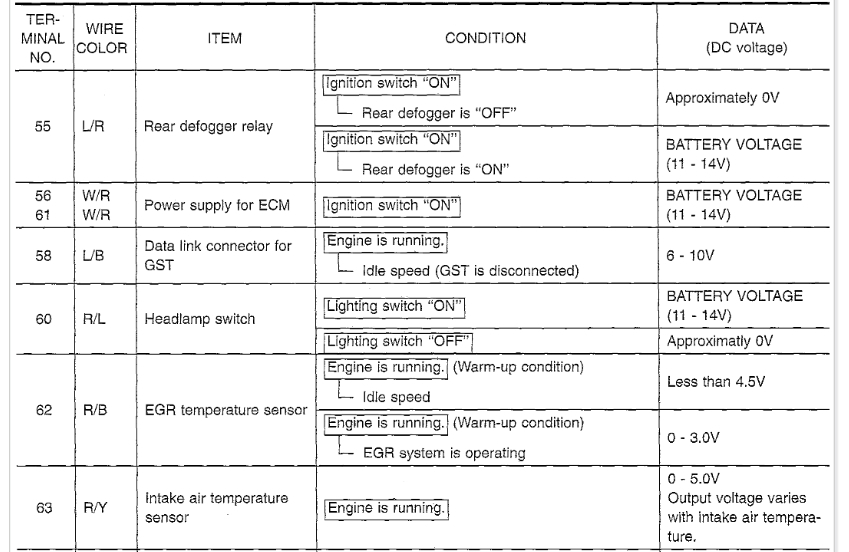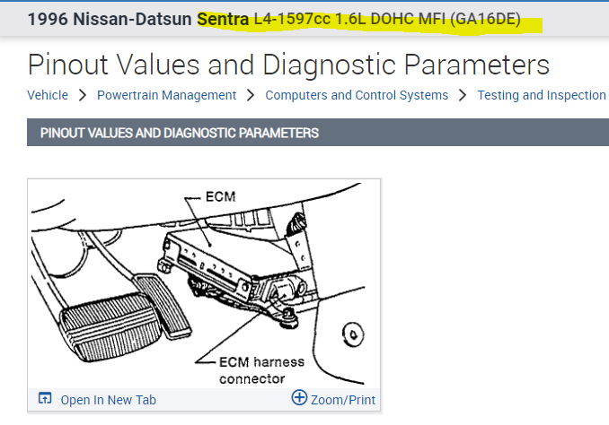 Take a look at what I attached. It is for 1996 Sentra L4-1597cc 1.6L DOHC MFI (GA16DE) It includes ECM information for either an automatic or manual transmission.