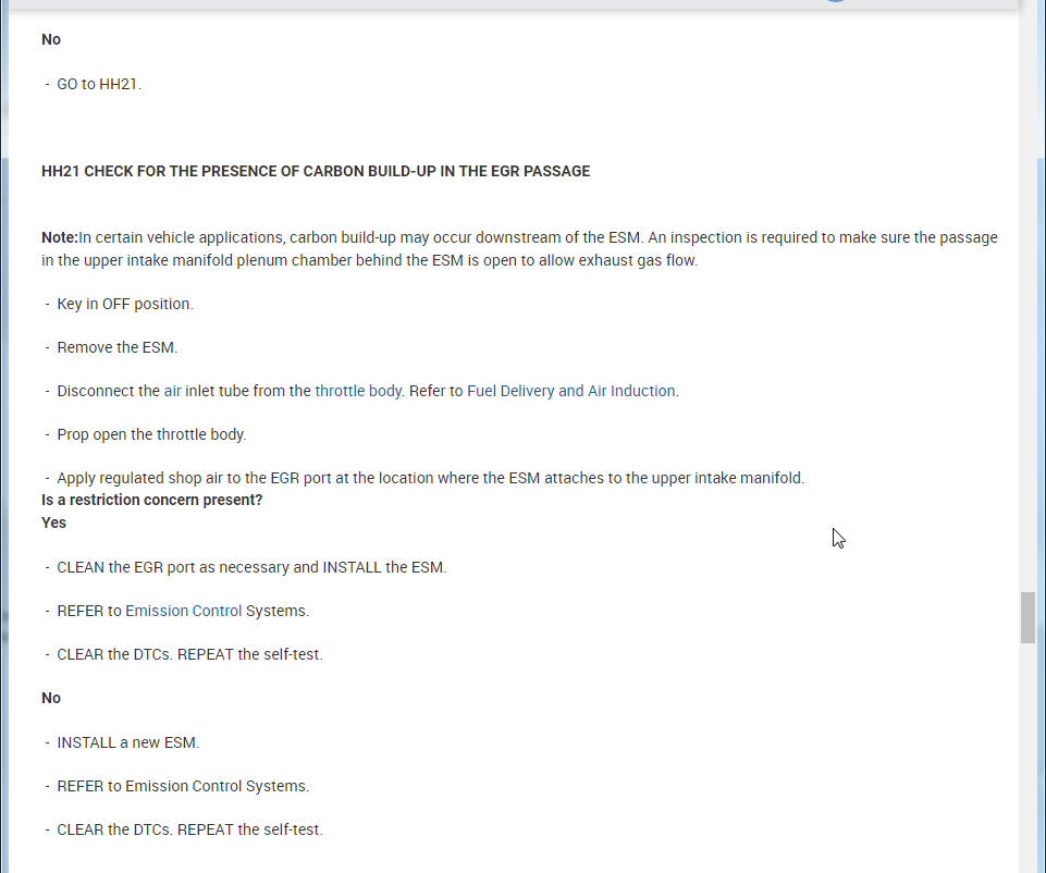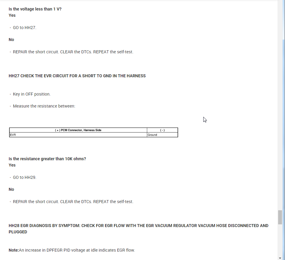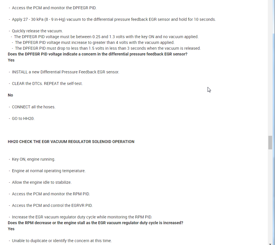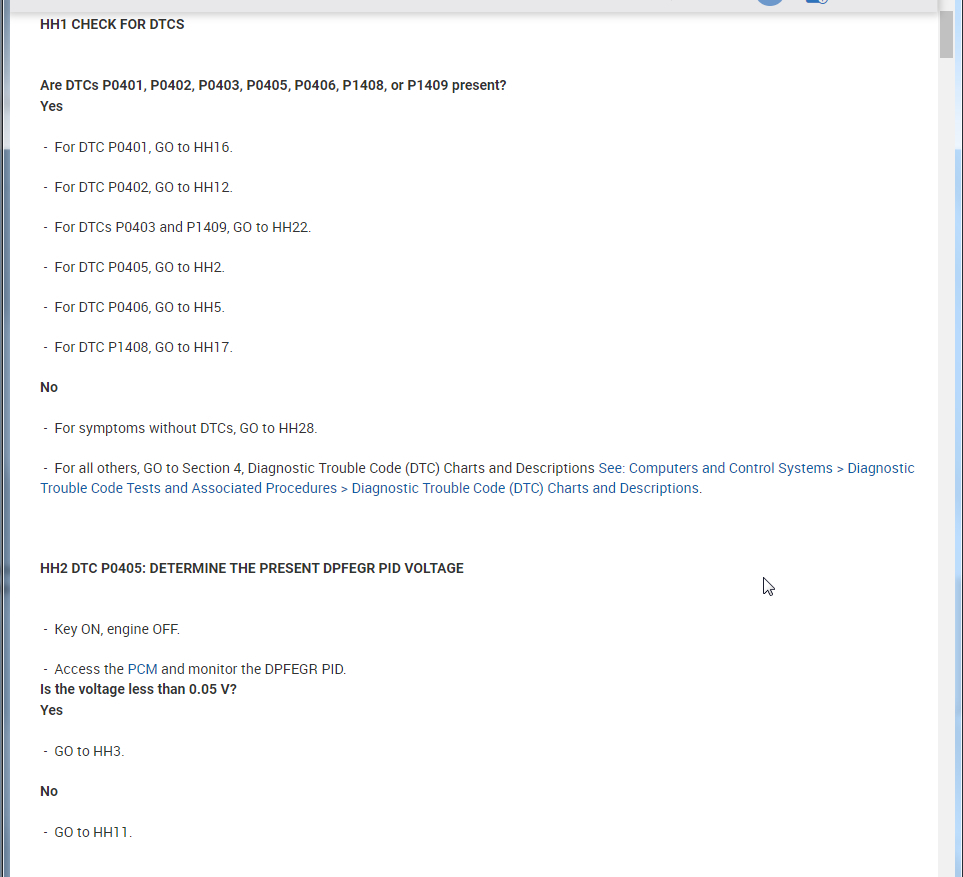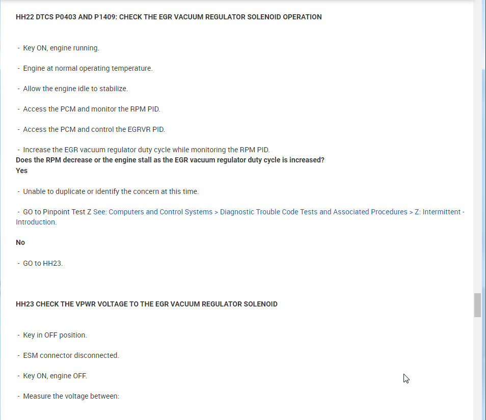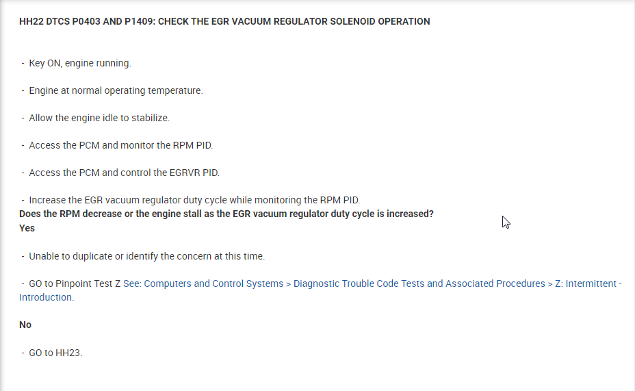For P0403 you start at HH22. This is asking you to check the operation of the EGR by using a scan tool. You don't have one so let's assume it does not stall when you perform this test because if it does then the issue is not present at this time so let's assume it is currently broken so it would answer this question as "No" and you go to HH23.