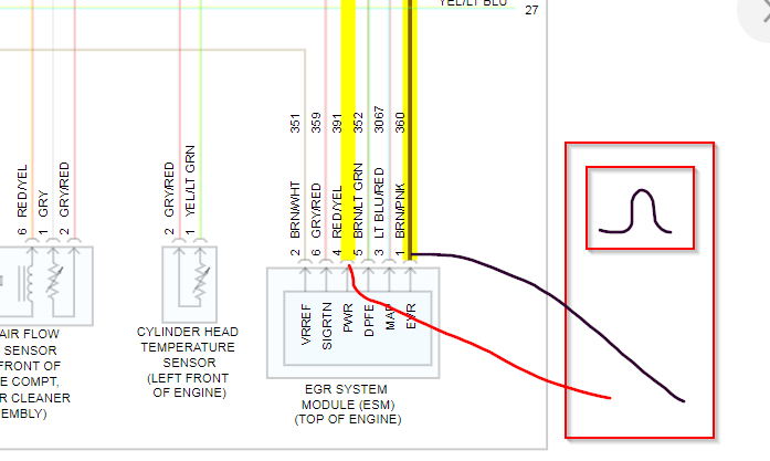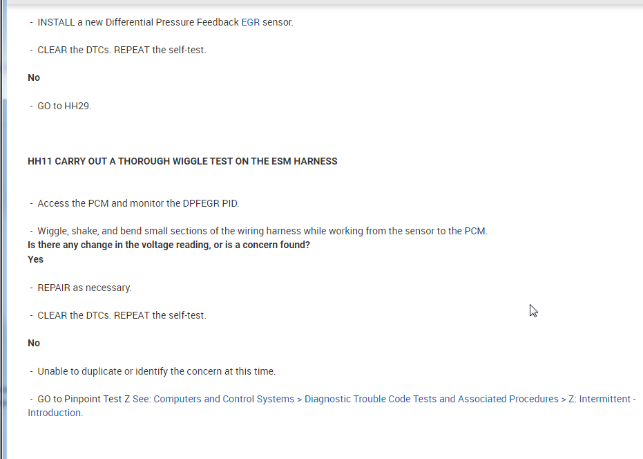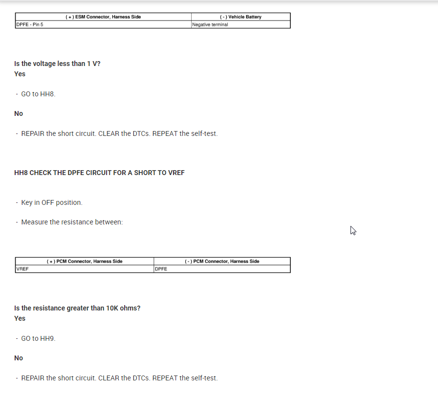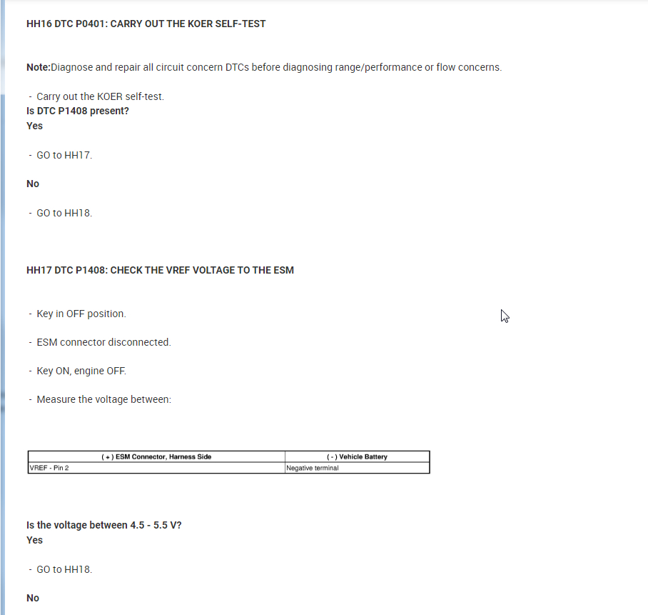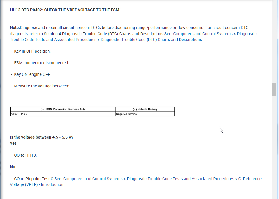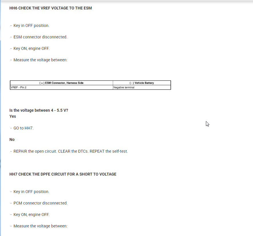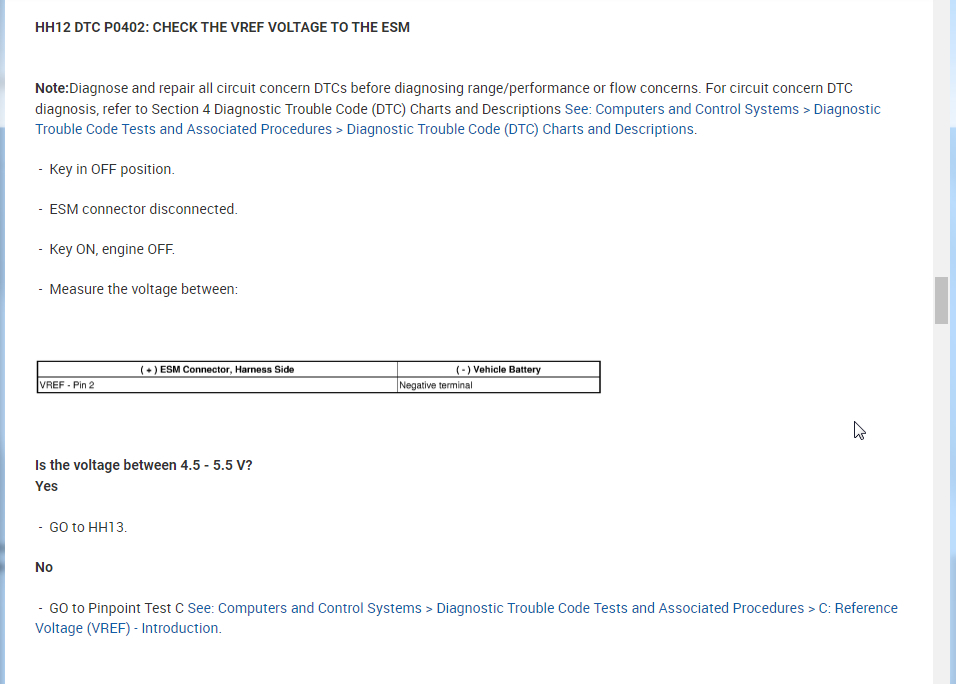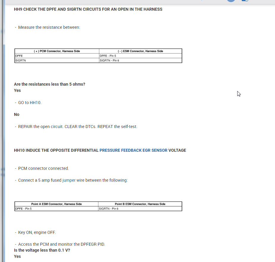 HH12 tells you to disconnect the EGR module (ESM) and check voltage on pin 2. Based on what you said it was 4.9v. It then asks you if it is between 4.5-5.5v. The answer is yes so you go to HH13.