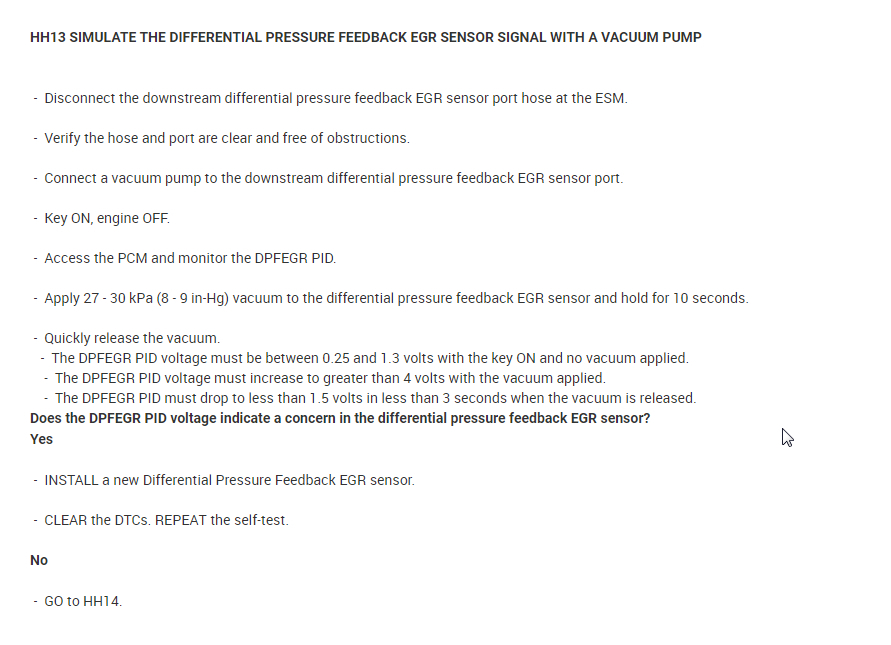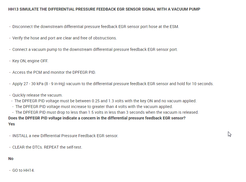HH13 says to monitor the data in the PCM with a scan tool. If you don't have that then you can monitor the voltage on the DPFE and get the same info. You will need a vacuum gauge/hand pump so that you can pull it into a 8-9 inch of mercury vacuum as it asks. Let's say it passes that and you move to HH14. If it did not then you replace the DPFE.