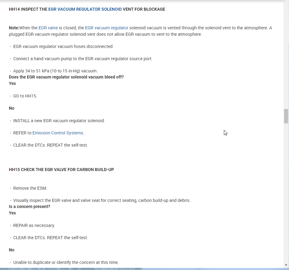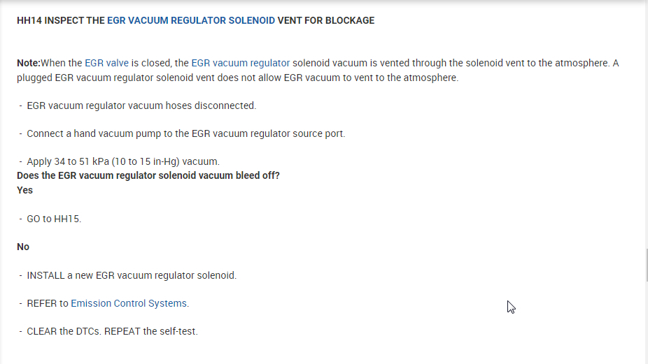 HH14 asks you to check for a blockage in the EGR regulator solenoid. Again, you need the vacuum hand pump again to pull it into a 10-15 in-hg vacuum. If this does not bleed off then you need a new EGR vacuum regulator solenoid. Let's say that passed and you move onto HH15.