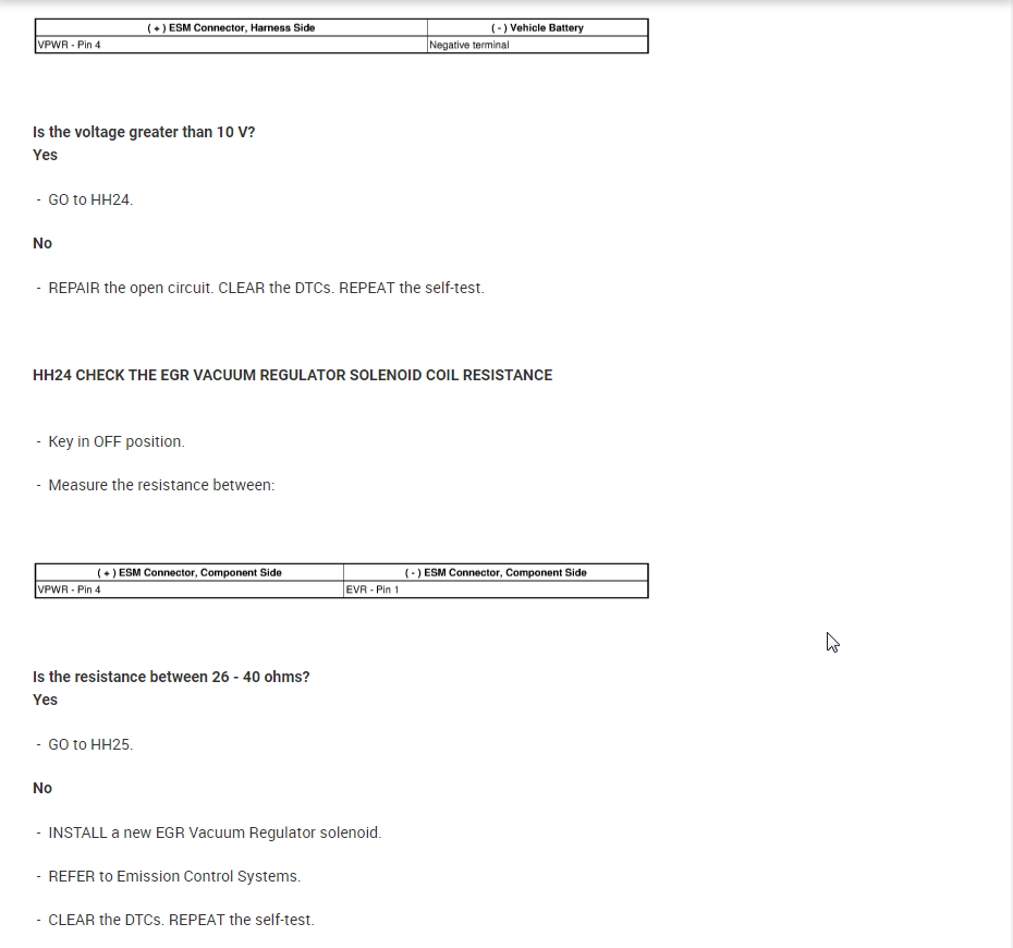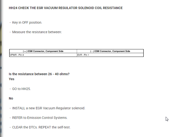 HH24 needs you to check the EGR coil and you do this by disconnecting the connector and measure resistance between pin 4 and pin 1. What is the resistance reading? Is it between 26-40 ohms? If it is not then you replace the EGR vacuum regulator solenoid. Let's assume it is and you go to HH25