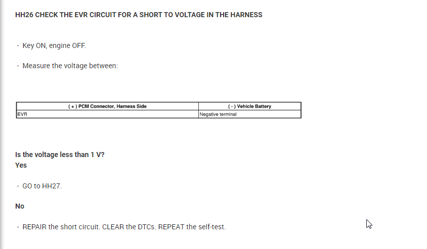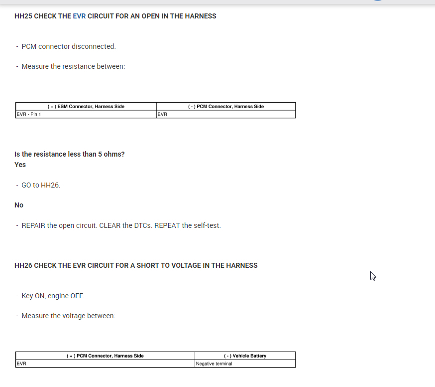 HH25 is asking you to check the harness for an open circuit. You need to disconnect the EGR Solenoid and the PCM and check resistance on that wire. The chart shows where to put your leads but basically you need to be on both ends of the wire. Let's assume it is less then 5 ohms. If not you have an open or high resistance and need to repair that wire.