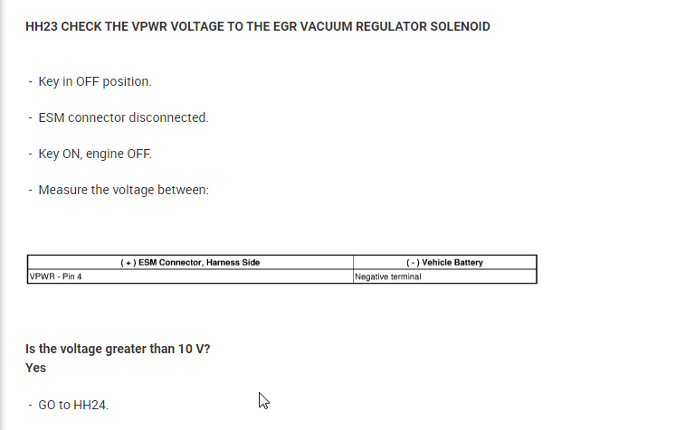 HH23 is asking you to check voltage from the EGR module (ESM) for voltage and based on your reading of 12 volts, you would answer yes that it is greater then 10v. Go to HH24