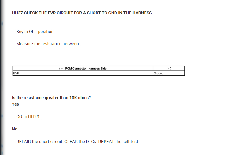 HH27 is asking to test for a short to ground. Again put your leads where it asks and do you have more then 10k ohms of resistance? If yes, then you have no continuity to ground which is good. If you do then you need to repair that wire. Proceed to HH29 if it passed.