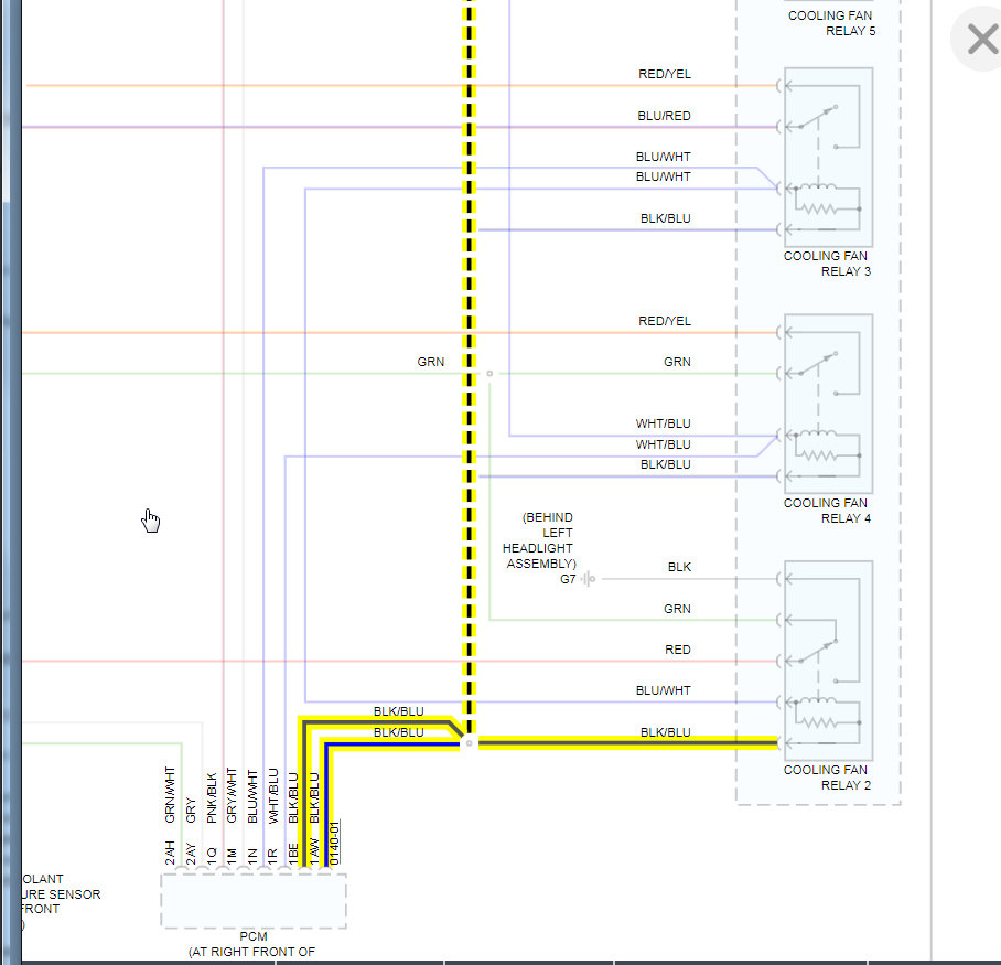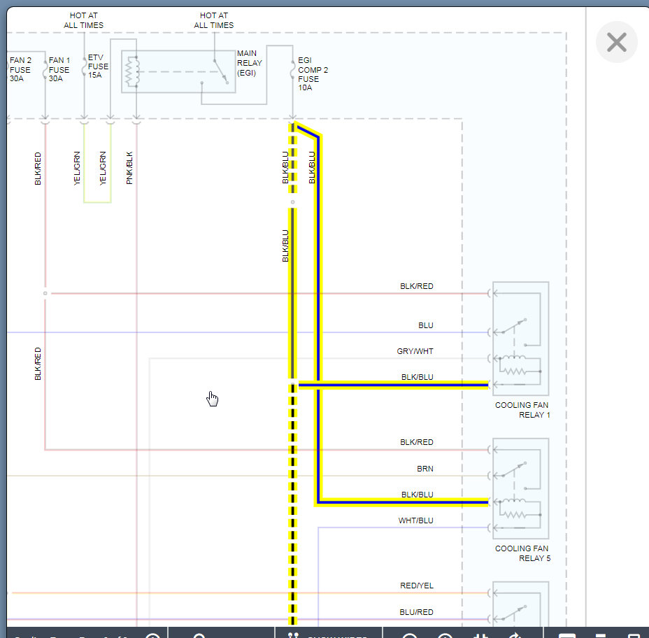 Car listed above is a Series 2 Mazda RX-8. I recently replaced the radiator, which isn't difficult but requires much disassembly of the front end. I got it put back together and running. As I was purging air from the system, I noticed the radiator fans weren't turning on. I was monitoring the coolant temperature via a Bluetooth OBDII scanner and it was hot enough that they should have switched on. I shut the car down and decided to pull the three fan relays from the main fuse block and bench test them. They all functioned properly. I reinstalled them in the fuse block and turned the ignition to ACC. I didn't hear the normal sounds of the fuel pump and air pump starting up. Instead, I heard a relay clicking continuously. This was different from when there is something like a bad battery. This was a constant click. I shut off the ignition and disconnected the battery (which is almost new and never had a problem with it). I waited about 5 minutes and reconnected the battery, and switched the ignition to ACC again. Same result - constant clicking of a relay. I looked around under the hood to see if I could identify the source of the sound. I then heard a loud "click" and everything went dead; nothing, even interior lights, was working. I disconnected the battery again and looked for blown fuses. I found the EGI Comp2 fuse had blown. I have a Mazda service manual for he car and started following the troubleshooting, starting with the radiator fan relays, doing what I could without connecting he battery. For each of the three fan relays in the main fuse block, I discovered there was continuity between one of the relay terminals and the body ground for all three relays, indicating a ground short (most likely melted wires somewhere). The service manual says to repair or replace the wiring harness for corrective action. I do my own work, but I'm not sure where to start.