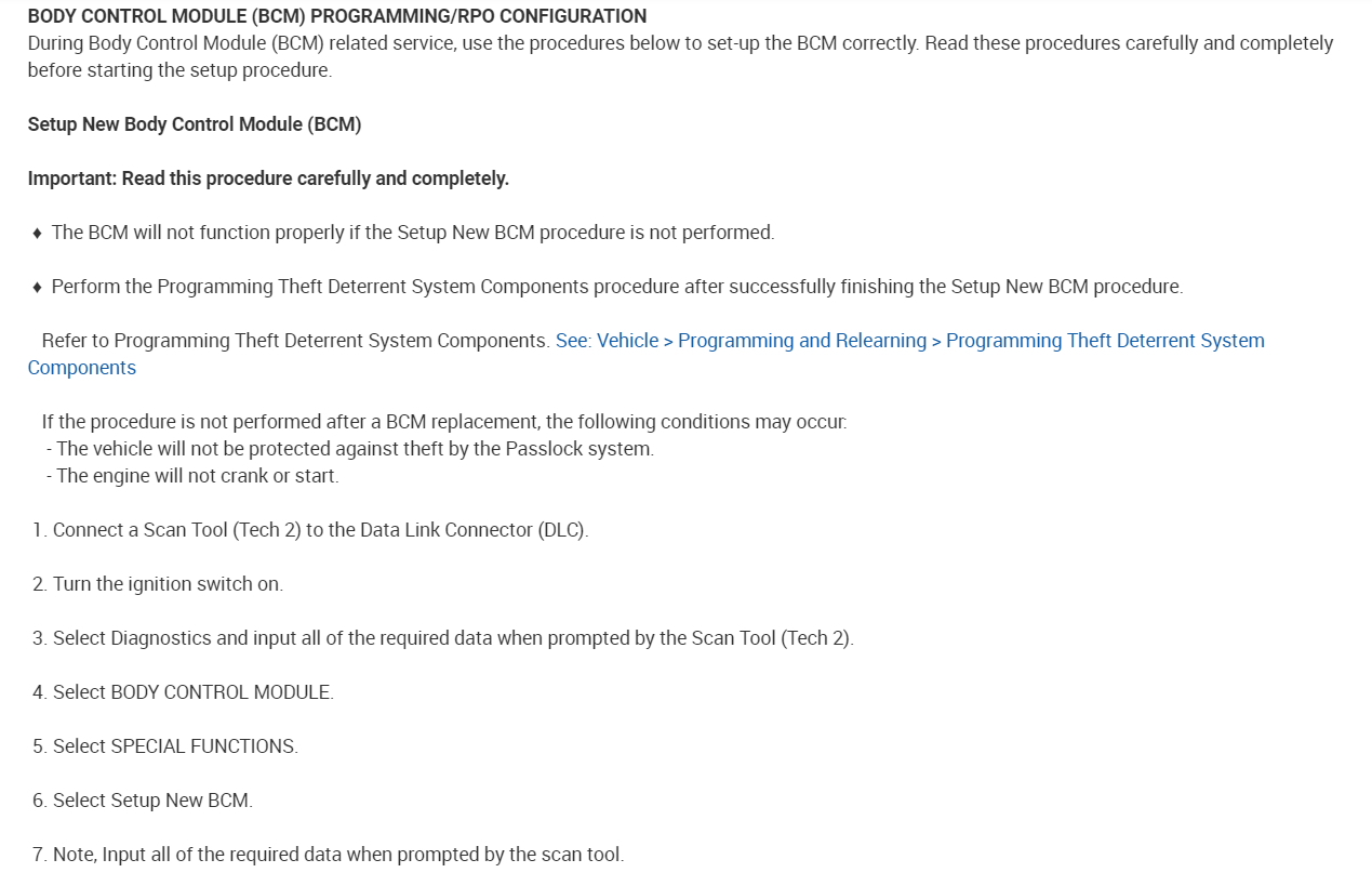 During Body Control Module (BCM) related service, use the procedures below to set-up the BCM correctly. Read these procedures carefully and completely before starting the setup procedure.
