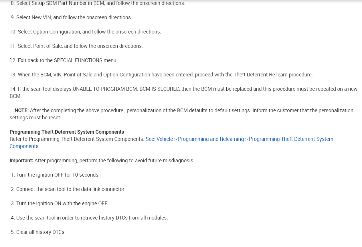 13. When the BCM, VIN, Point of Sale and Option Configuration have been entered, proceed with the Theft Deterrent Re-learn procedure.