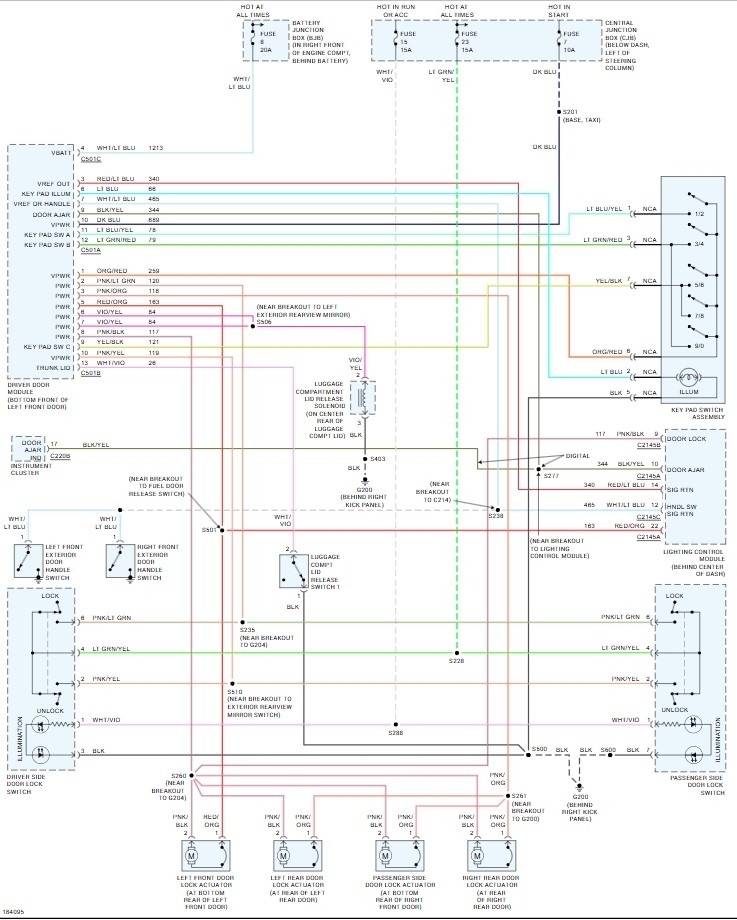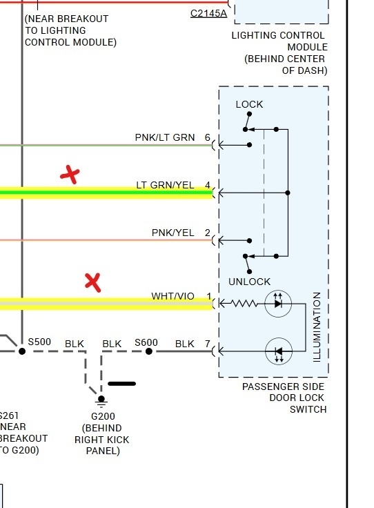 If the powers and grounds check out okay on that end the next step would be to check for the powers and grounds at the door control module in the driver's side door. You can check two of them at the passenger side door switch. You should have battery voltage at the Light Green w yellow wire on pin 4 and with the key on power at the White w violet wire on pin 1.