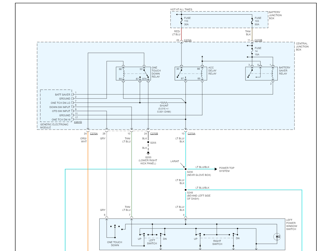 My truck has an electrical issue. I was going to repair the overhead console when I rolled down the driver's front window. When I went to roll it back up it wouldn't go up. I tried the passenger side window from the switch on the driver side. It wouldn't go down. So, I went to the passenger side switch and tried it. It still didn't go down. I pulled the panel off to check the switch and wiring. The guy I bought the truck from cut the wires. I didn't see any that came loose or anything. I checked the fuses and relay. Everything else works. I think it's awfully odd for two switches or two window motors to go out at the same time. I checked the wires for power and ground. It's not getting neither power nor ground. Unless I'm not doing something right. I've watched YouTube videos and I did exactly what they said to do. There is no video dealing with this specific problem. What do you think is the problem? The signal lights work, the wipers work, interior lights work, dash lights work, everything else is fine. The previous owner cut the wires to change the plug I'm guessing. The wires are twisted together instead of done right. Thanks ahead of time. Fuses and relays are good. But no power is getting to the switch. I haven't had any problems with this truck since I purchased it about 3 months ago until now.