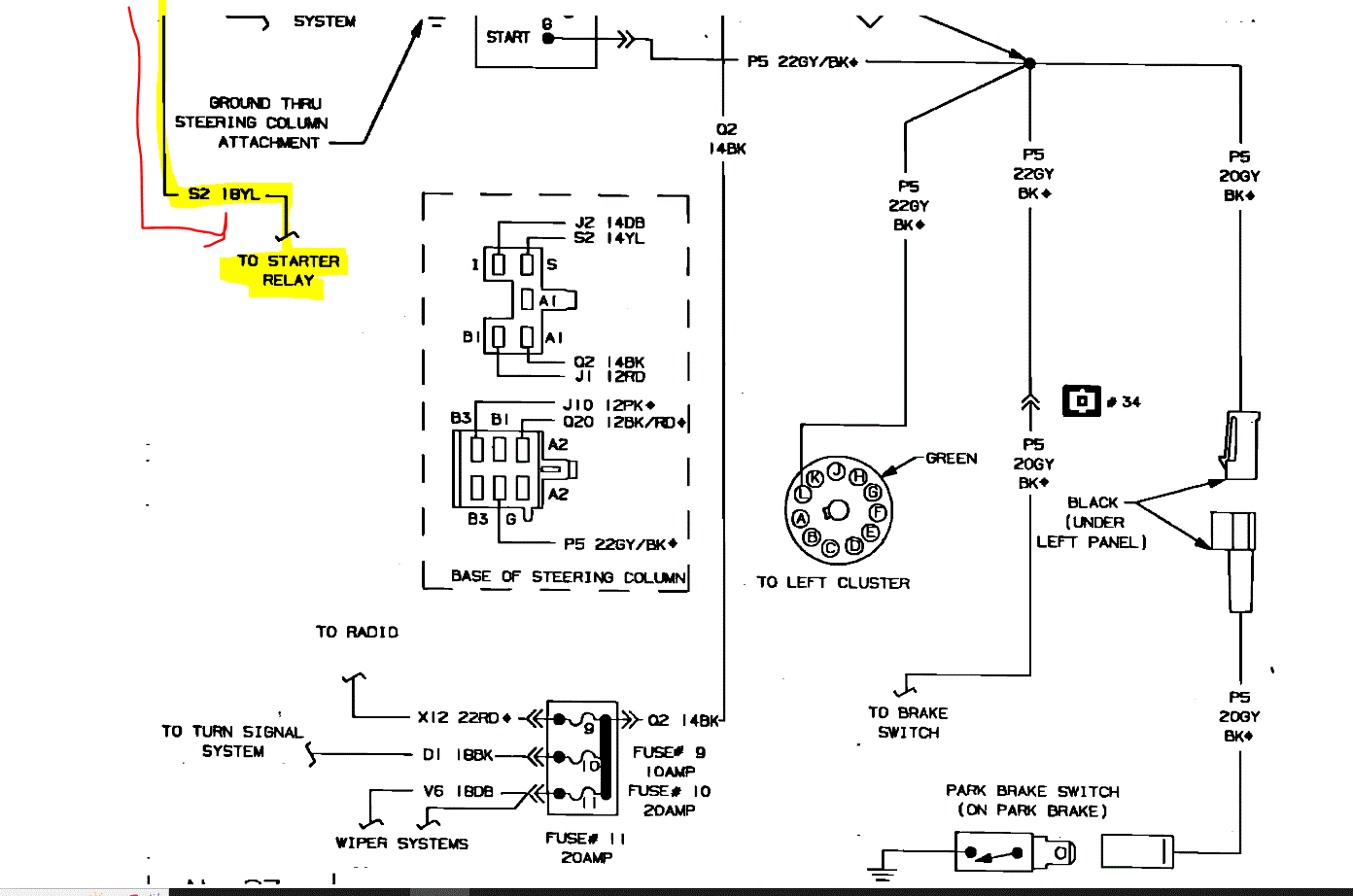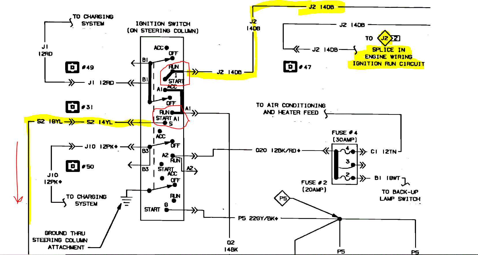 Next, I attached pics of the schematic that I'm reading. Take a look at it and let me know if the wire colors match what you have. Keep in mind, they may have faded. I highlighted the power supply to the starter relay.