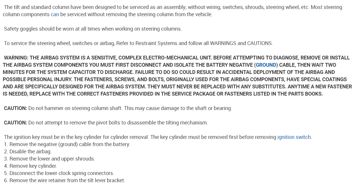 To service the steering wheel, switches or airbag, Refer to Restraints and follow all WARNINGS and CAUTIONS.