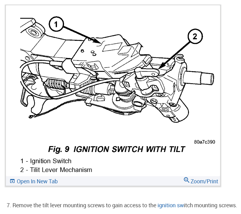 7. Remove the tilt lever mounting screws to gain access to the ignition switch (1) mounting screws.