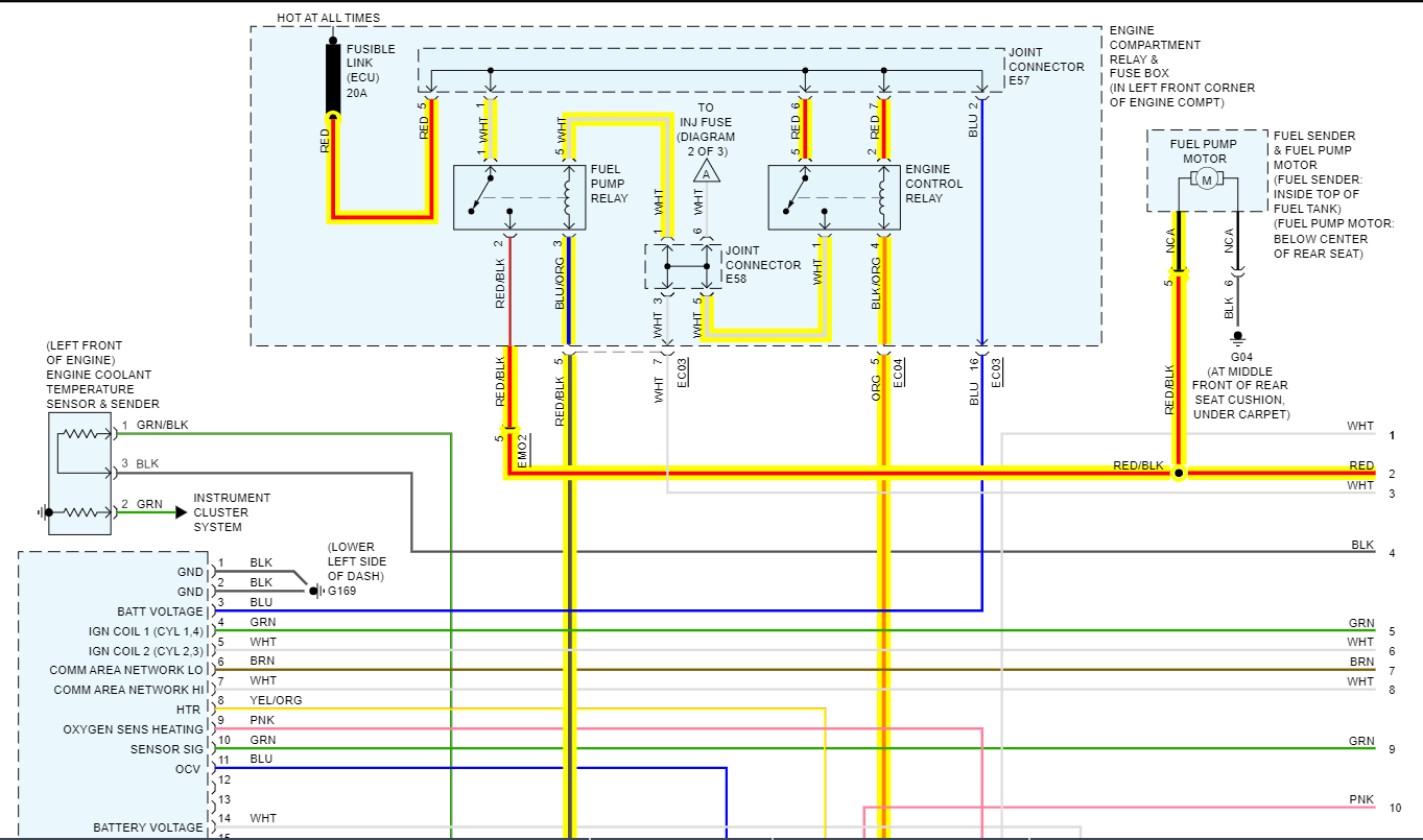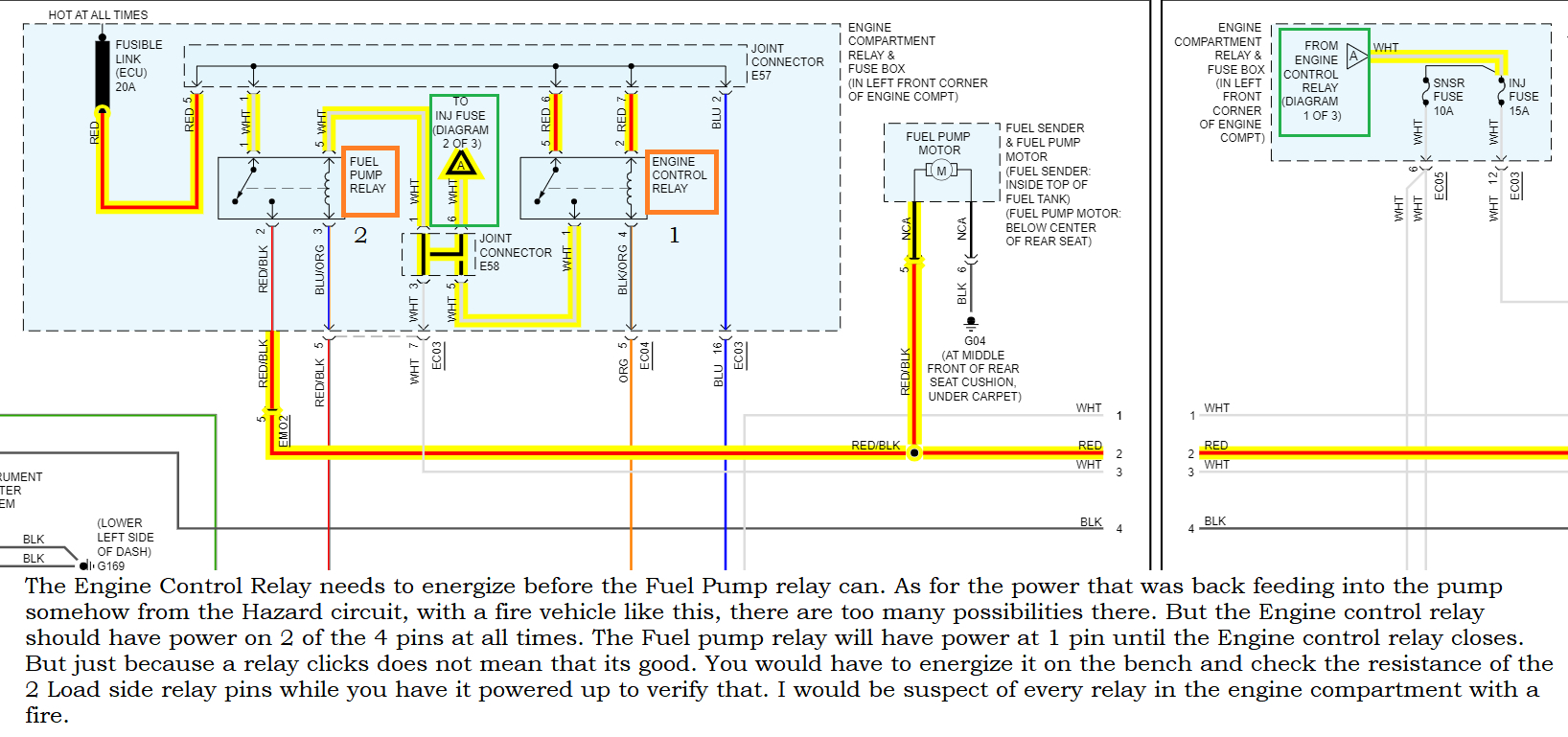 The car listed above caught fire and melted all the wording hoses and belts. Suspension and front end melted too. Since then I've replaced the belts hoses and put a whole wire harness in. It's also got another ECM because I figured that when it melted it shorted out something. And the front end has new CV axles and struts. I was checking fuses, and the hazard light fuse was blown. When the car caught fire the hazard lights were on. So, the switch was on. Now when I put a good fuse in the hazard light fuse spot the fuel pump would come on without the key in it. I hooked the switch up and turned the hazard light off and now the fuel pump will not come on with the key. I checked the pump, and it works, and I've got power to the relay under the hood. I'm stumped.
