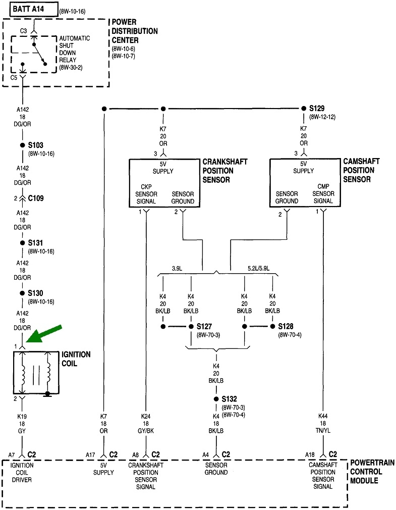 Look for the wire that is the same color at the ignition coil, every injector, or either smaller terminal on the back of the alternator. That is usually a dark green / orange wire as shown in these diagrams. Back-probe through the rubber weather seal, then have a helper run the ignition switch. Proper operation is the test light, (ASD relay), will turn on for one second when the ignition switch is turned to "run", then it will turn off. What is important is they must turn on again once the engine is rotating, (cranking or running). If they do turn back on during cranking, we'll have to look for a problem in the ignition system or the fuel pump system, but not both. Those are by far the two least common failures.