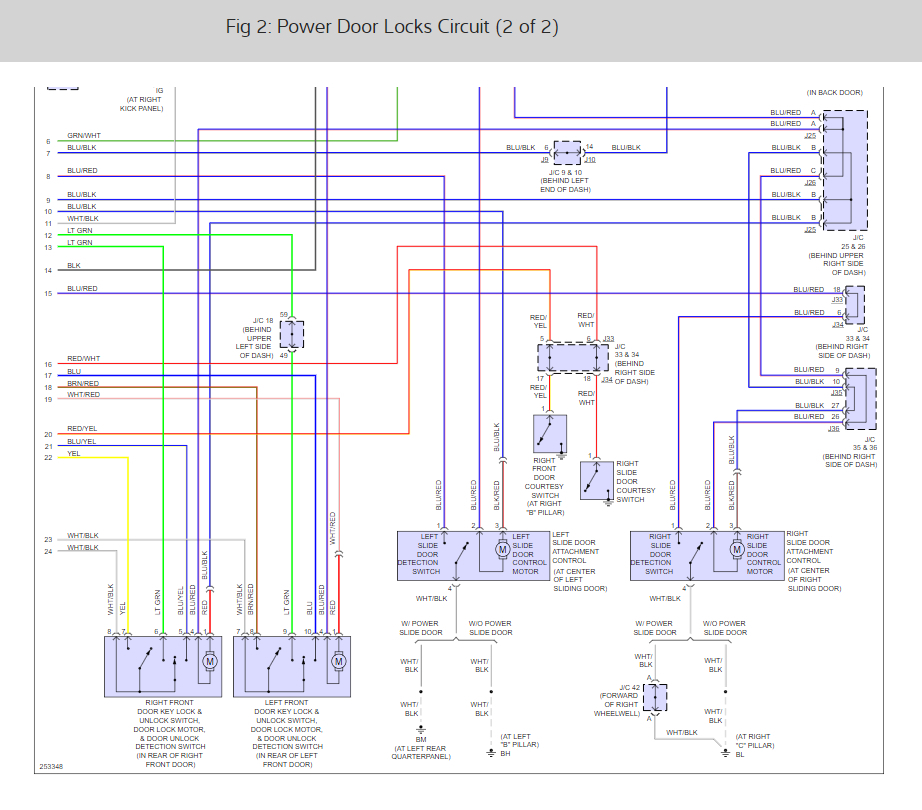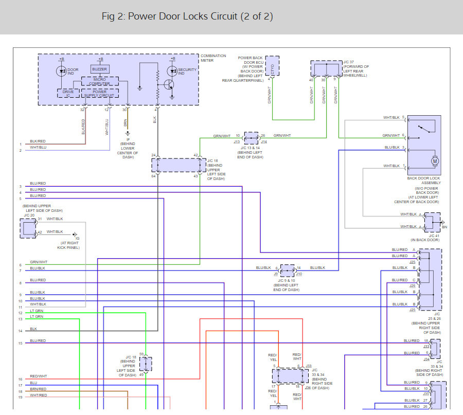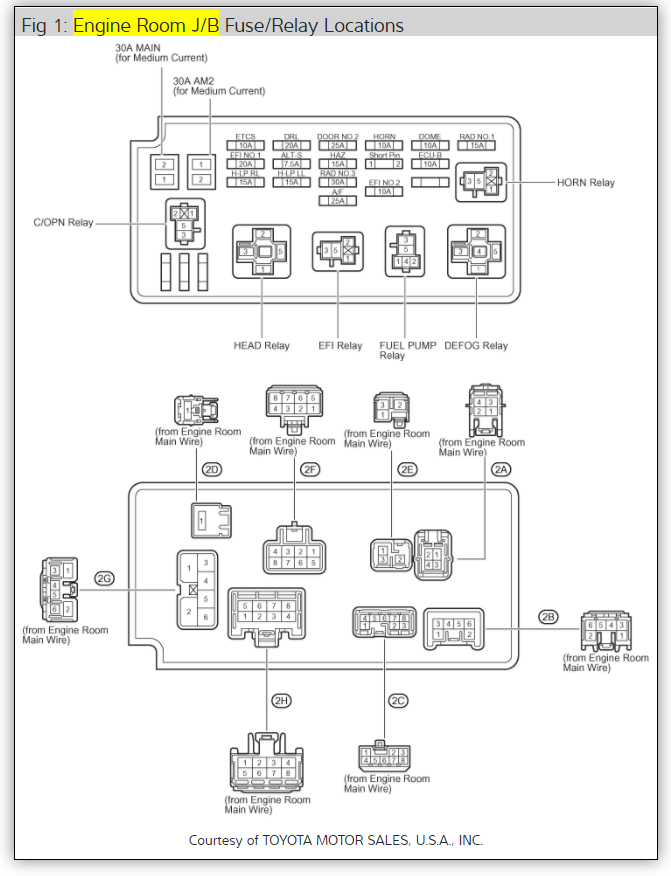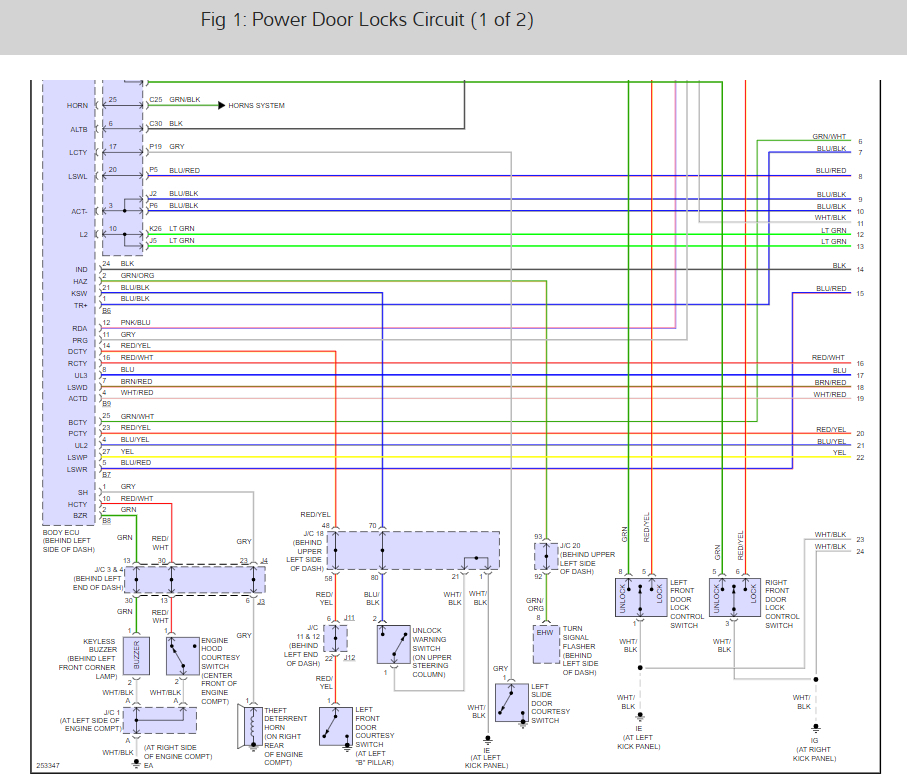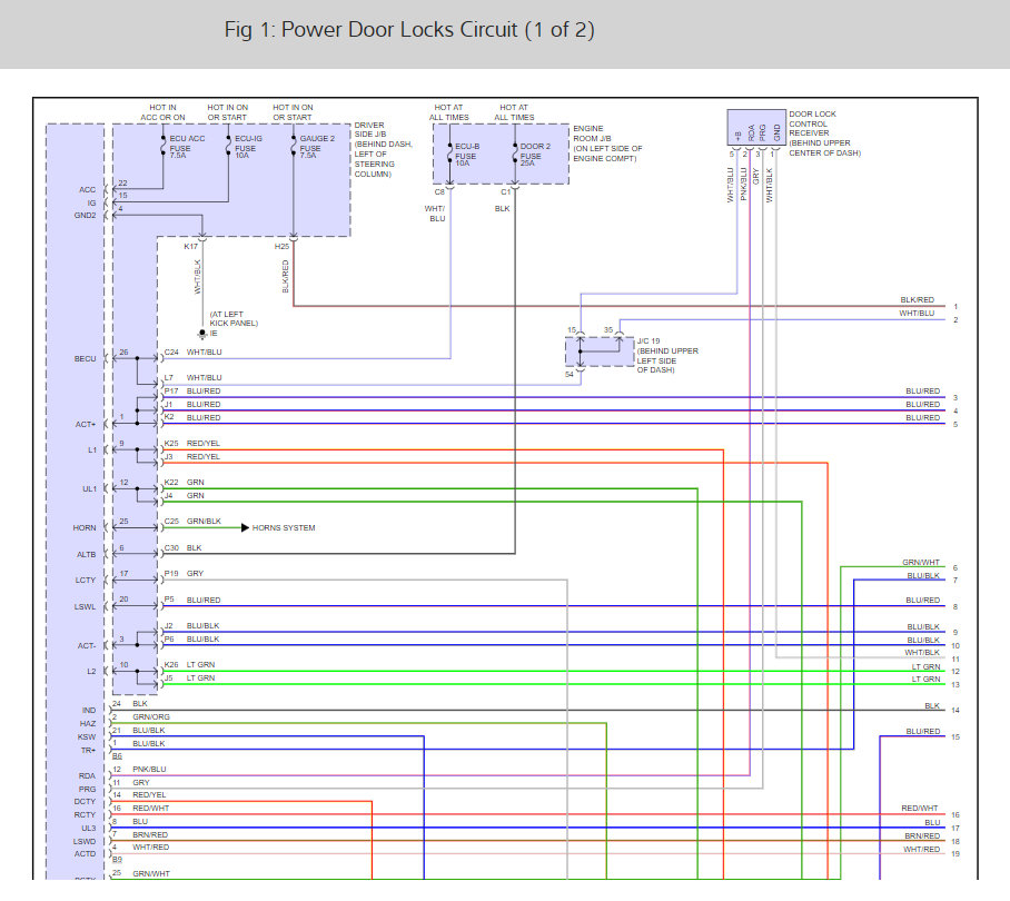 We first should look at the fuses that run the system which are ECU ACC, ECU IG, Gauge 2, ECU B, and Door 2. Here is a guide to help walk us through the test and the fuse locations ans well as the door lock wiring diagrams so you can see how it works: