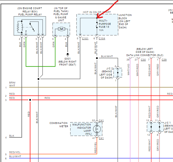 The fuel pump gets its voltage from the terminal right before multipurpose fuse in the fuse panel on the left side of the dash. Here is the wiring diagram so you can see what I am talking about. Please check the voltage at the fuse to help us see where the voltage drop is. Check out the images (below). Please let us know what happens.
