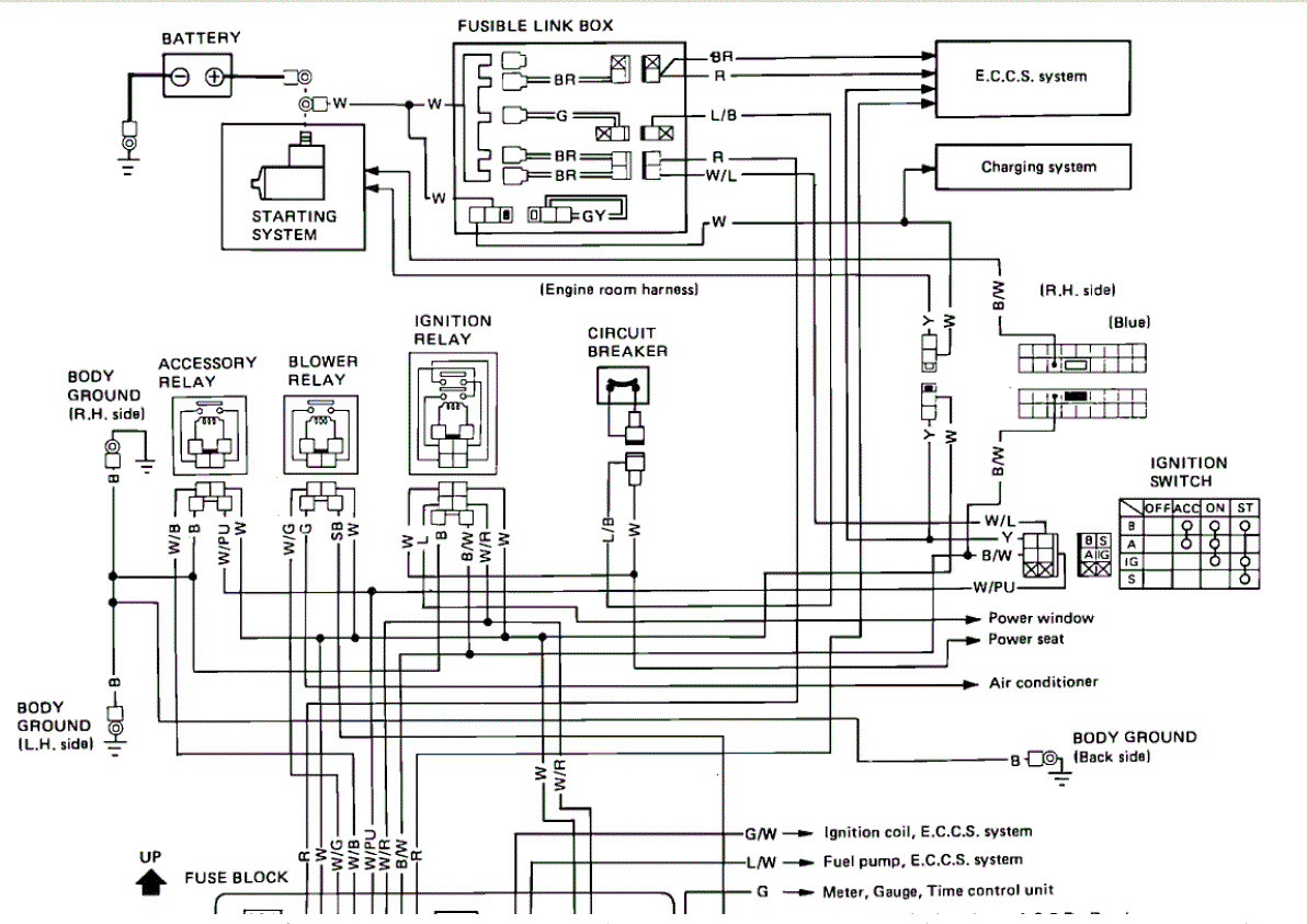 I attached the power distribution schematic below. I know the lights work, but the other things you mentioned seem to be through the ignition switch. What I need you to do is follow the wiring schematic below from the fusible links back to the ignition switch. See if you lose power at any point.