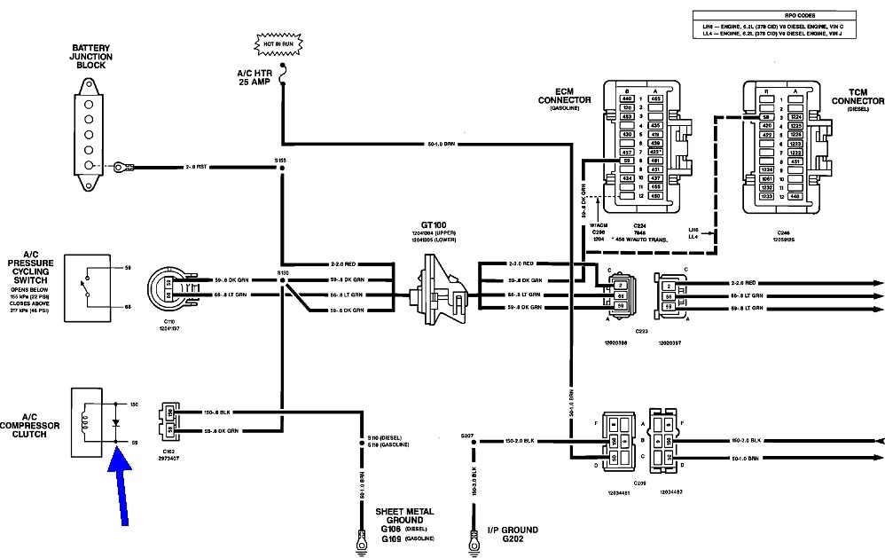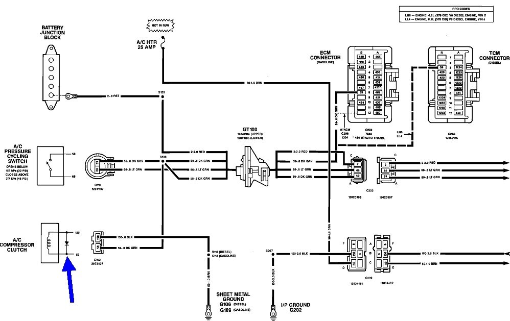 There's other diodes all over the vehicle for this purpose. Some are built right into the relays. Yours can be soldered between the two compressor wires. It could be added inside the fuse box if you cared to go through that much work. If you know of anyone who has scrapped out a tv in the past, there's two or four diodes in the power supply, usually near the power cord, that will handle the job. Those 15-cent replacements we bought were rated at 2.5 amps and 1500 volts. That's much higher than what most original diodes are rated for. By the way, for this type of circuit, you need a diode with the ratings specified, as a minimum, but any with higher ratings is just better.