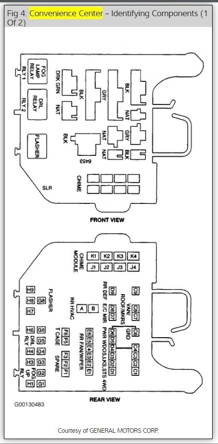 4 - Gauges 10 Amp (Red) DRL Relay, DRL Module Buzzer, Headlamp Switch, Keyless Entry, Cluster/Gauges, Low Coolant Module, Convenience Center Electrochromatic Rearview Mirror with Compass