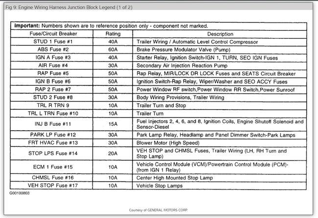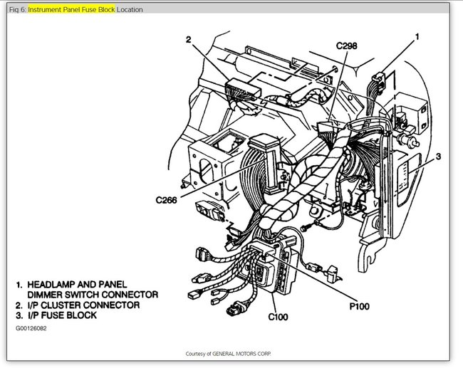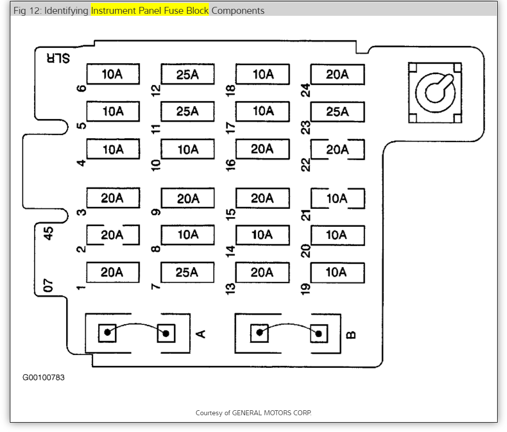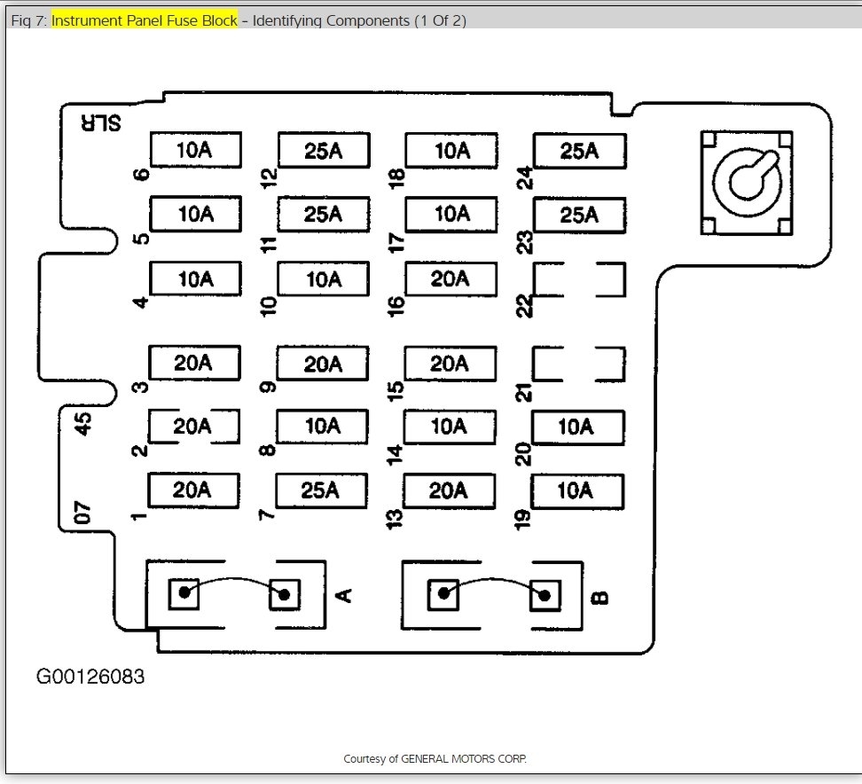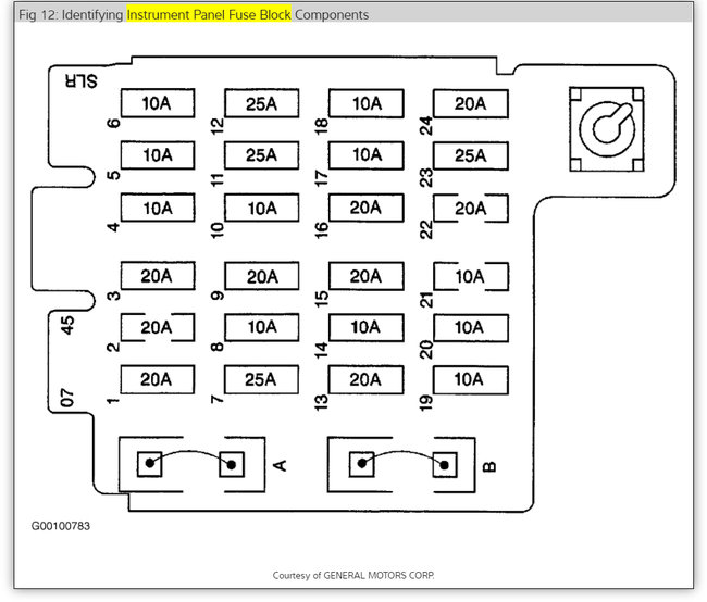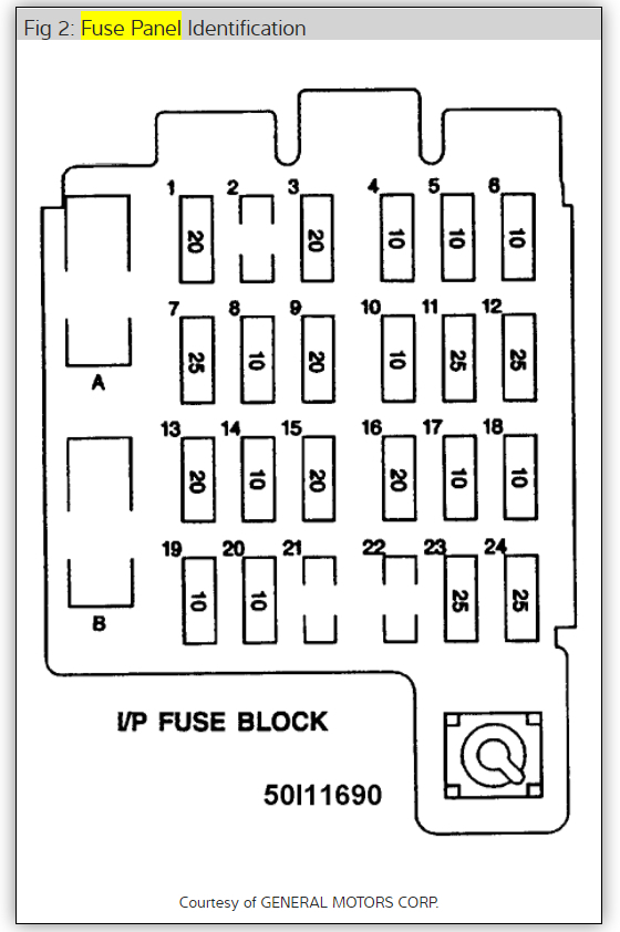 1 - Stop/Haz 20 Amp (Yellow) Stop/TCC Switch, Hazard Flasher, Seat Belt Reminder, Stoplights, CHMSL (Center High Mounted Stop Light)