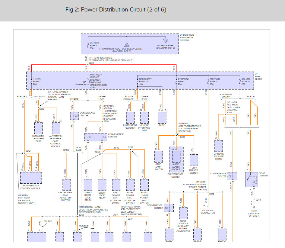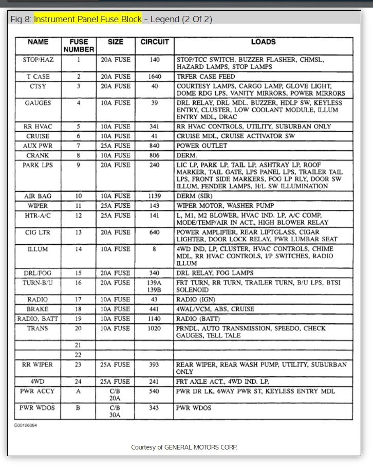 A - PWR ACCY 20 Amp - C/K Reg. & Ext. Cab (Circuit Breaker) Power Door Lock, 6 Way Power Seat, Keyless Entry Module 30 Amp - C/K Crew Cab (Circuit Breaker) Power Door Lock, 6 Way Power Seat, Keyless Entry Module