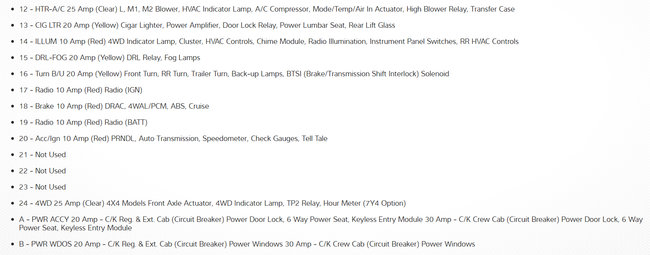 12 - HTR-A/C 25 Amp (Clear) L, M1, M2 Blower, HVAC Indicator Lamp, A/C Compressor, Mode/Temp/Air In Actuator, High Blower Relay, Transfer Case