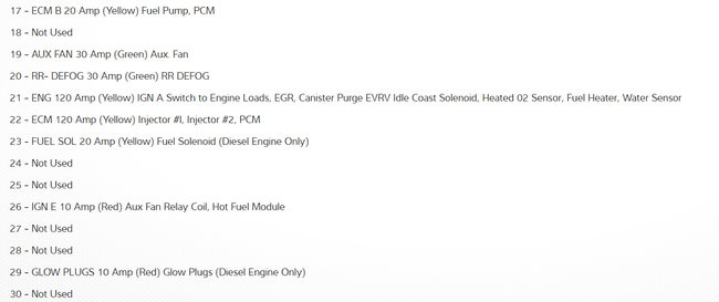 21 - ENG 1 20 Amp (Yellow) IGN A Switch to Engine Loads, EGR, Canister Purge EVRV Idle Coast Solenoid, Heated O2 Sensor, Fuel Heater, Water Sensor