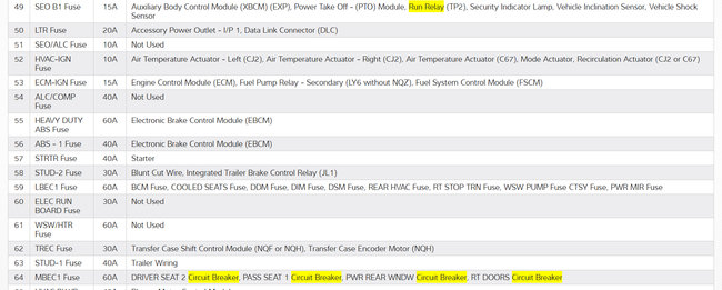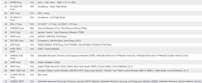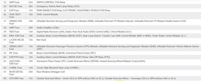 16 - Turn B/U 20 Amp (Yellow) Front Turn, RR Turn, Trailer Turn, Back-up Lamps, BTSI (Brake/Transmission Shift Interlock) Solenoid