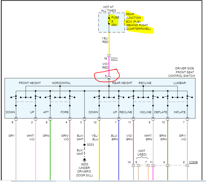 Next, at the seat switch, there will be a violet wire with a red tracer. That is the power wire. I need you to check if it has power to it. If it does, then either the switch is faulty, or the motors have failed. If there is no power, return the switch. We need to find where there is an open circuit in that wire.