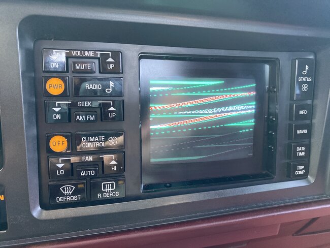 Your first photo looks like a picture tube tv that lost its horizontal hold. If that really is a picture tube, they require a really high voltage to run that tube. That can be over 20,000 volts. You'll see a fat wire with a rubber cap where it plugs into the side of the tube. Stay clear of that while the unit is running. The horizontal output circuit is what develops that high voltage, so if you can see anything on the screen, it's working, but that doesn't mean it's "in sync". Being out of sync is what makes the picture turn into those horizontal lines. That used to happen to tvs when the set was not in sync with the cameras at the tv studio, or the signal they were broadcasting. I'm not sure what they would be syncing to in a car. The tv studio, in effect, is right there in the same unit. I'm thinking out loud now. That Central Power Supply you mentioned might be the system that develops that high voltage to run the crt. If it is, follow that wire plugged into the side of the crt back to its source. That would be the high voltage transformer. In tvs, those were ripe for broken solder connections where they mounted to the circuit board. Some are held on first with two screws, then the pins are soldered to the board, but a lot of them didn't use those screws. Just the pins held the transformer in place. That's a lot of weight to ask of them, especially in a vehicle that's bouncing and vibrating. In some tv models, the right broken pin's solder connection could keep the transformer working, but the feedback circuit wasn't there to keep the screen in sync with the pulses in the broadcast signal. That would give you the horizontal lines like you have.