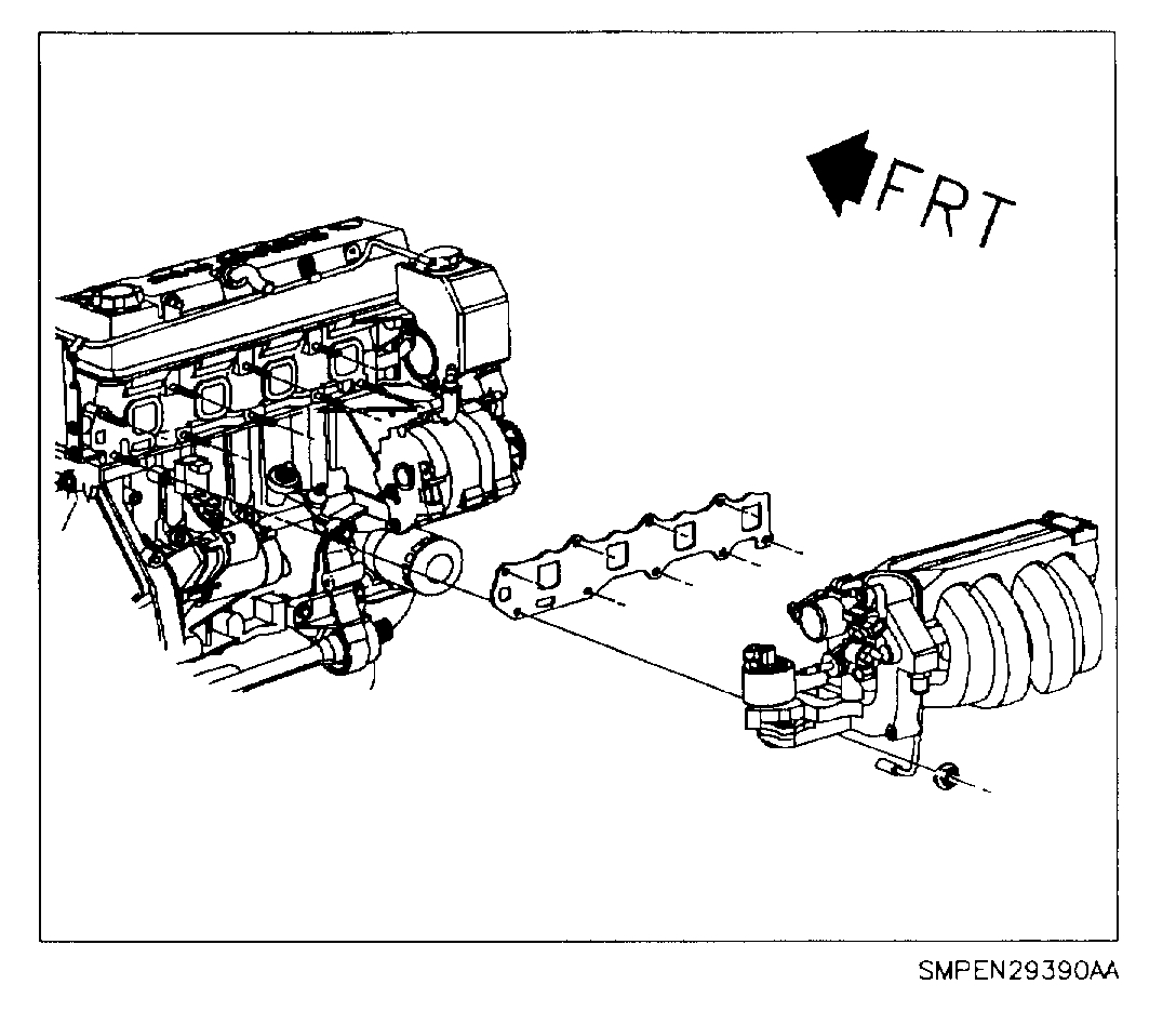 21. Remove intake manifold gasket and discard. Clean cylinder head and intake manifold gasket sealing surfaces. Inspect surfaces as outlines in the "SOHC (L24) Cylinder Head".