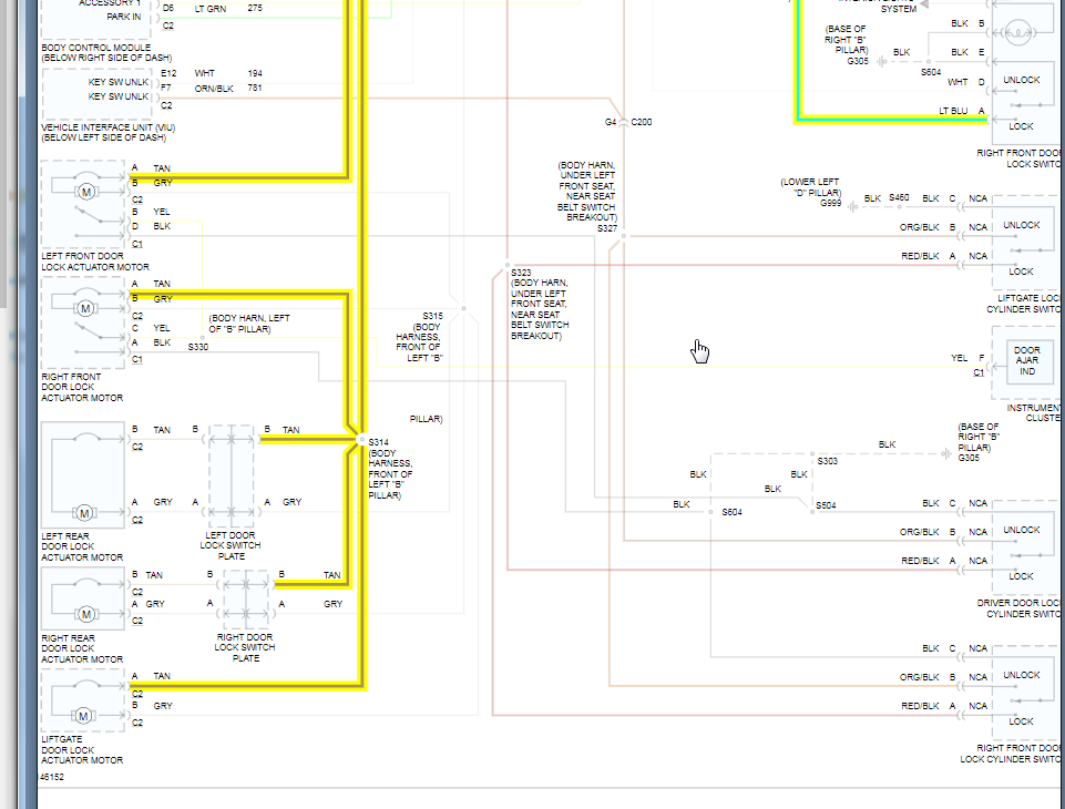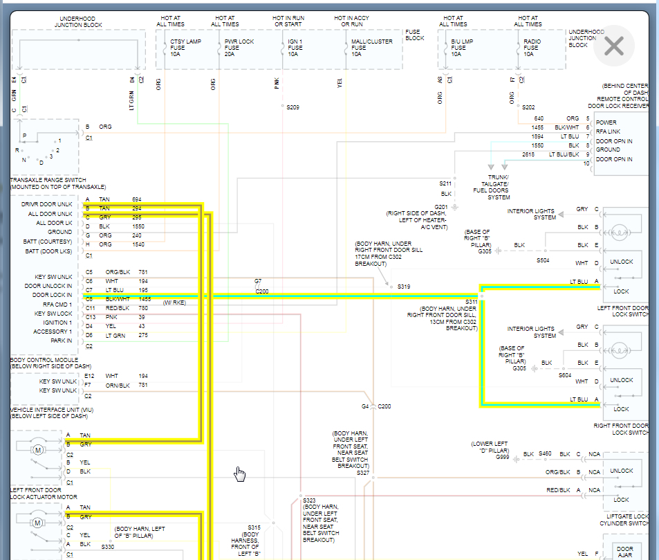 I attached the wiring diagram and we need to test voltage coming out of the BCM on the green wire (input to the BCM from the switch) and then the tank wire on the BCM. This is the command wire. So I suspect you will have voltage at the BCM on the green wire and then nothing on the tan wire. If that is the case, replace the BCM and hopefully all the issues will be fixed.