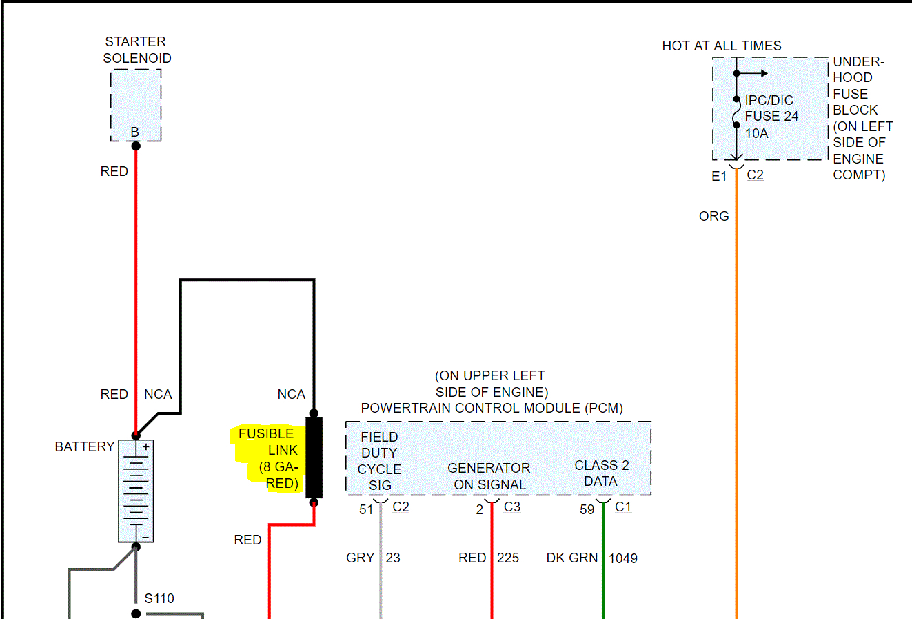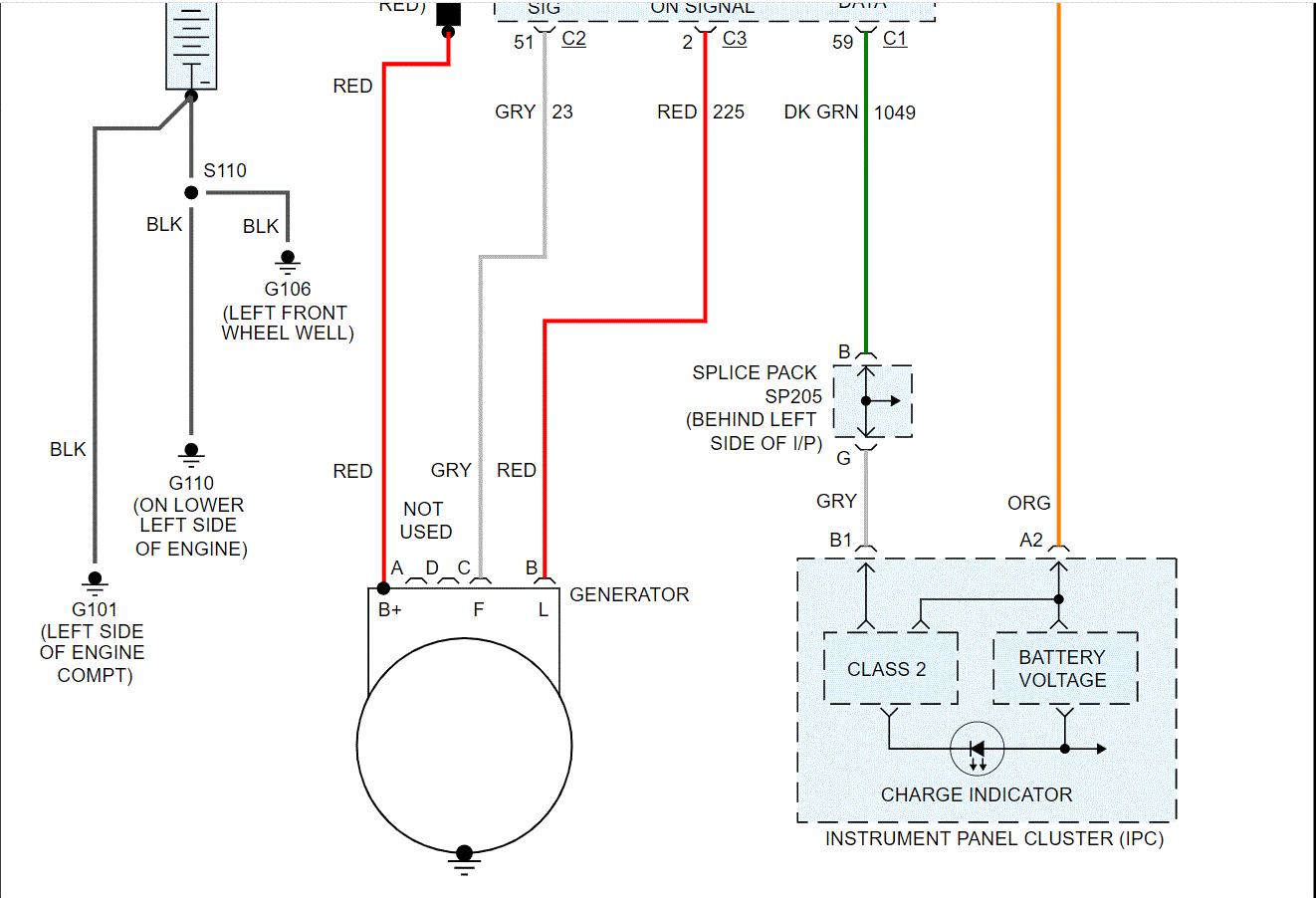 •Battery only reading 11.3Volts (less than one year old) voltage at alternator while running is the same as battery.