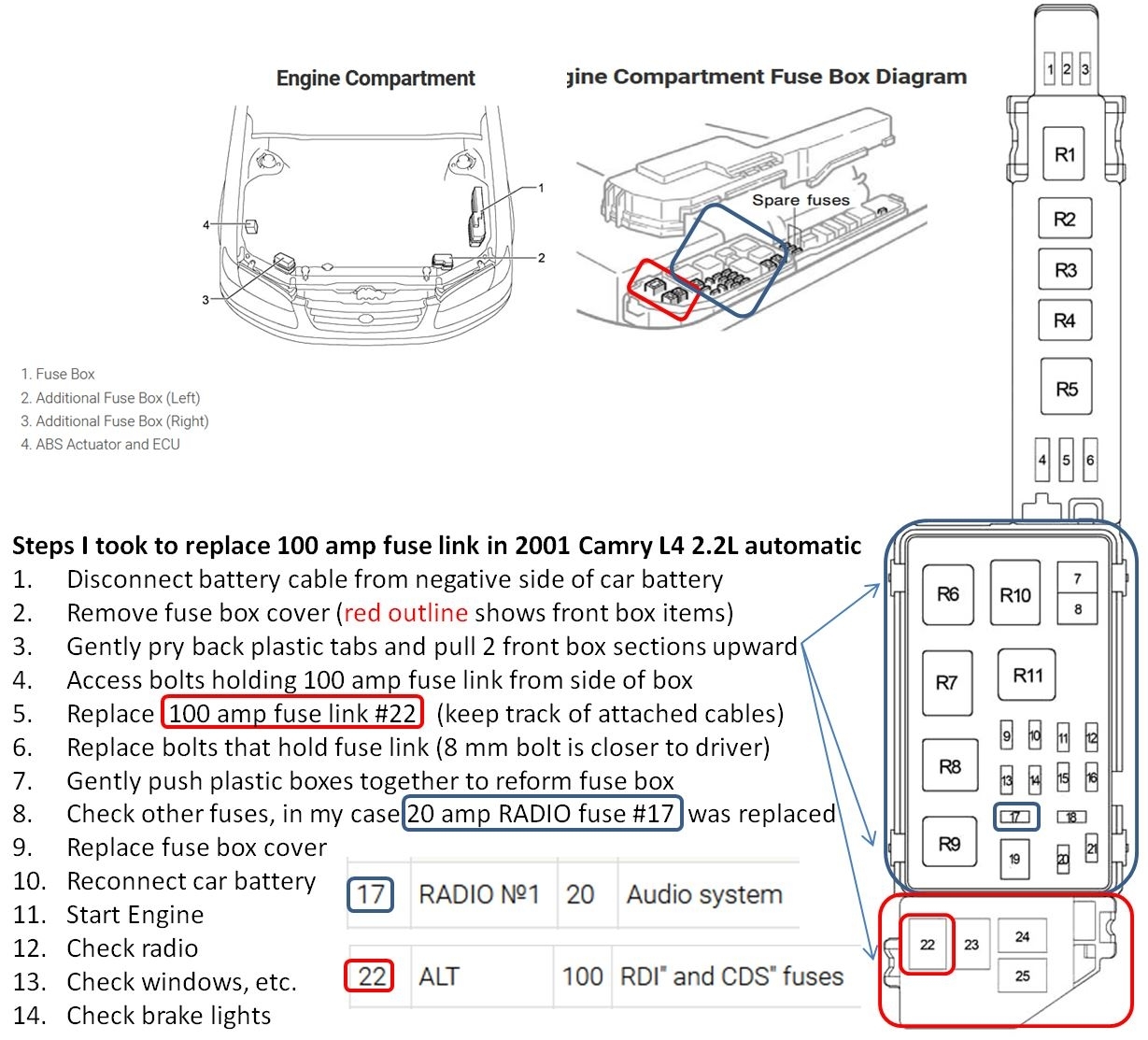 I jump started the car listed above that had a drained battery. I had the jumper cables on wrong polarity for ~30 seconds. After that, I did get the car to start but all of the electronics no longer work. I cannot even see the odometer. When the engine was running, I used an Actron Battery/Alternator tester to confirm the battery was not being charged. I tested the Actron Battery/Alternator tester on a different car and the tool does its job. I suspect a blown fuse simply because nothing is working. Will hunt for that but otherwise would appreciate any suggestions. It was a 100 amp fuse link.