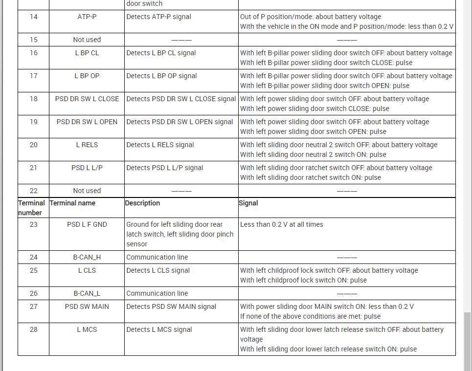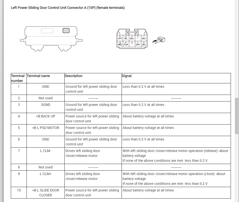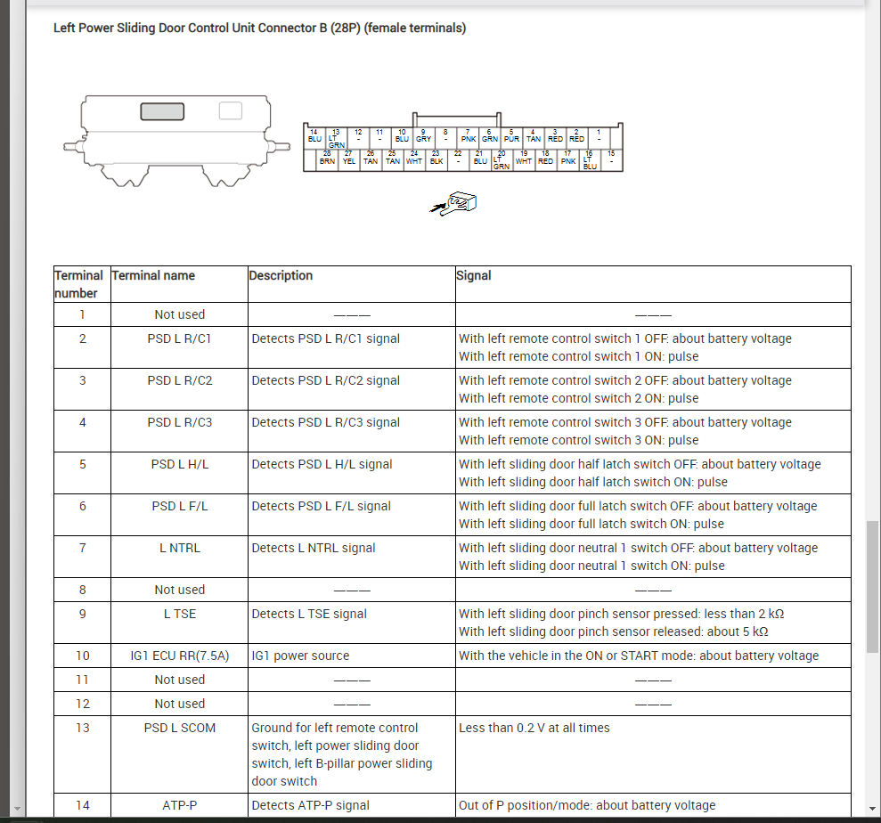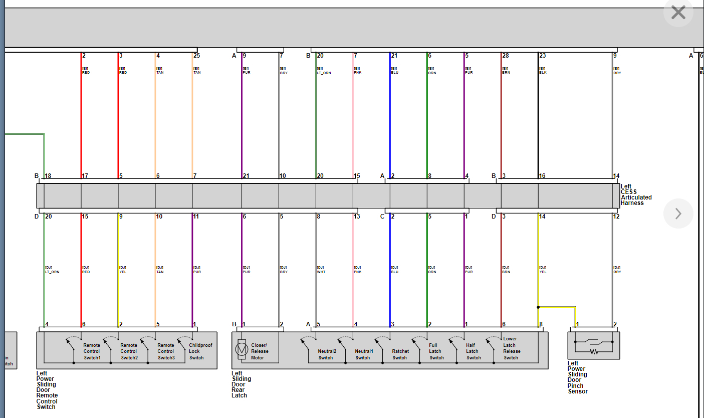 Unfortunately, some wires to sliding door are broken. Some green wires are disconnected from connector, and I do not know where green wires should be connected. It is 21 pin (it is 22 pin but one is without plug) connector as I added the photo. Just to be clear which wire where connect the second junction of connector is colorful wires. The second end of this cable is placed on the door. And one connector have many green wires and second way of connector is with colorful wires too. And these colors are not the same. :-(