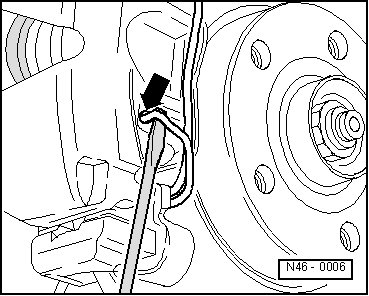 - Using screwdriver, pry off brake pad retaining spring from brake caliper - arrow - and remove.