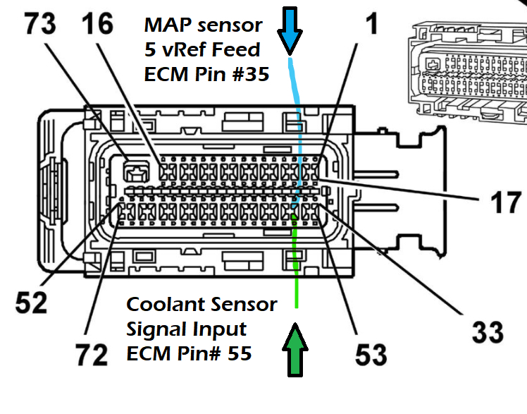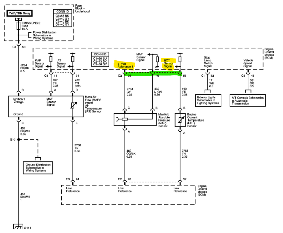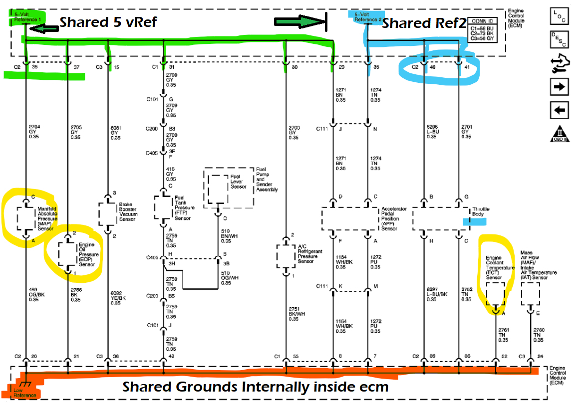 I'm not sure if you unplugged the ECM C2 connector or not, but I think this is what's happening, after seeing where the pin locations were and that the coolant sensor code can set due to a "different Reference voltage being shorted to it", this would explain why you're not reading anything at ECM pins 35 and 37, I just wondering why you're not getting any other codes, unless it's because the Map sensors Ref V is first in line and being pulled down first, therefore messing with the ECM.